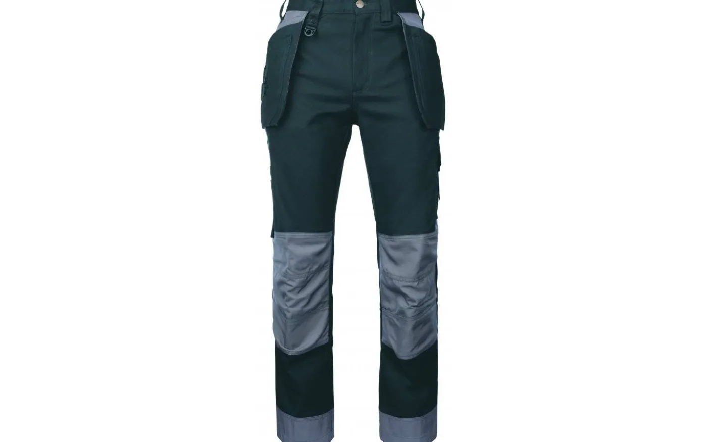 Två hängande undanstoppningsbara spikfickor, en med extra fickor och en med verktygshällor. Spikfickorna förstärkta med 100 % Cordura®. Benfickor med telefonficka, pennficka och verktygsficka. Två reglerbara hammarhankar. Två D-ringar. Tumstocksficka med verktygsficka och knivknapp. Knäfickor i Cordura®, öppning inifrån och reglerbar höjd av knäskydden. Förböjda knän. Förstärkt längst ner på benen med Cordura®. Bakfickor med övervidd. Ficklock på vänster bakficka. Fäste för id-kortshållare.