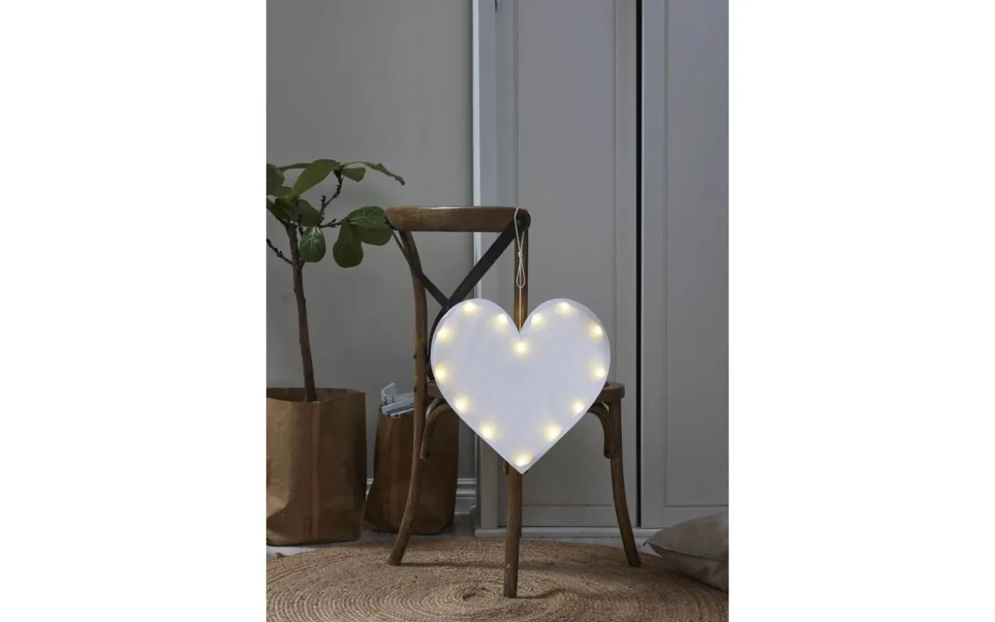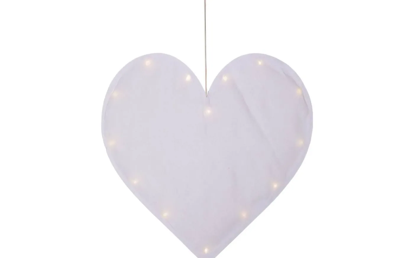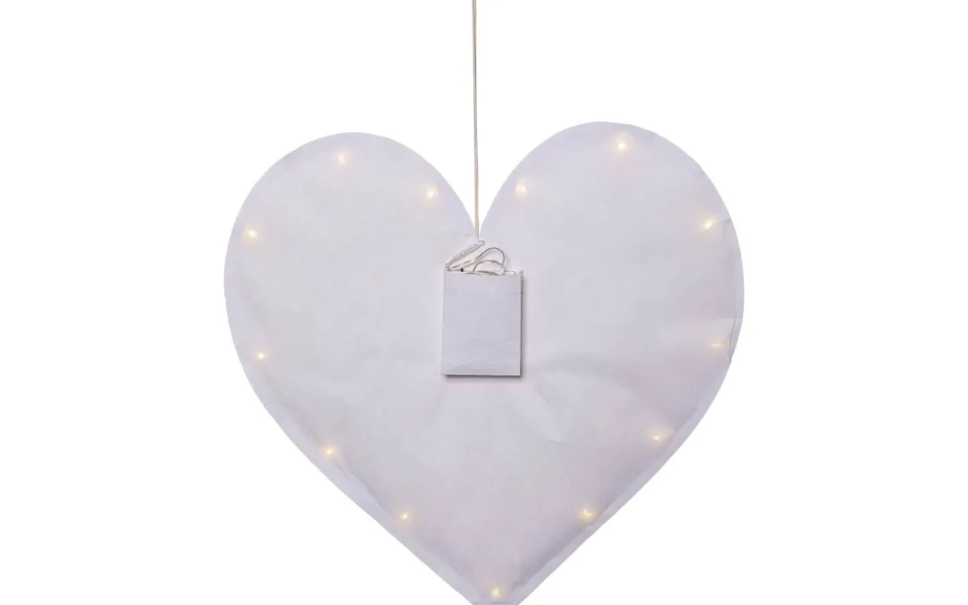 Vitt hjärta i papper. Hjärtat är lätt vadderat och lyser med små LED- punkter. En stilren dekoration som lyser dubbelsidigt. Häng den i ett fönster, mot en dörr eller spegel. Kan med lätthet placeras på många ställen i hemmet och skapa en mysig stämning. Produkten drivs av batteri och har timer. 3 batterier AA ingår ej.