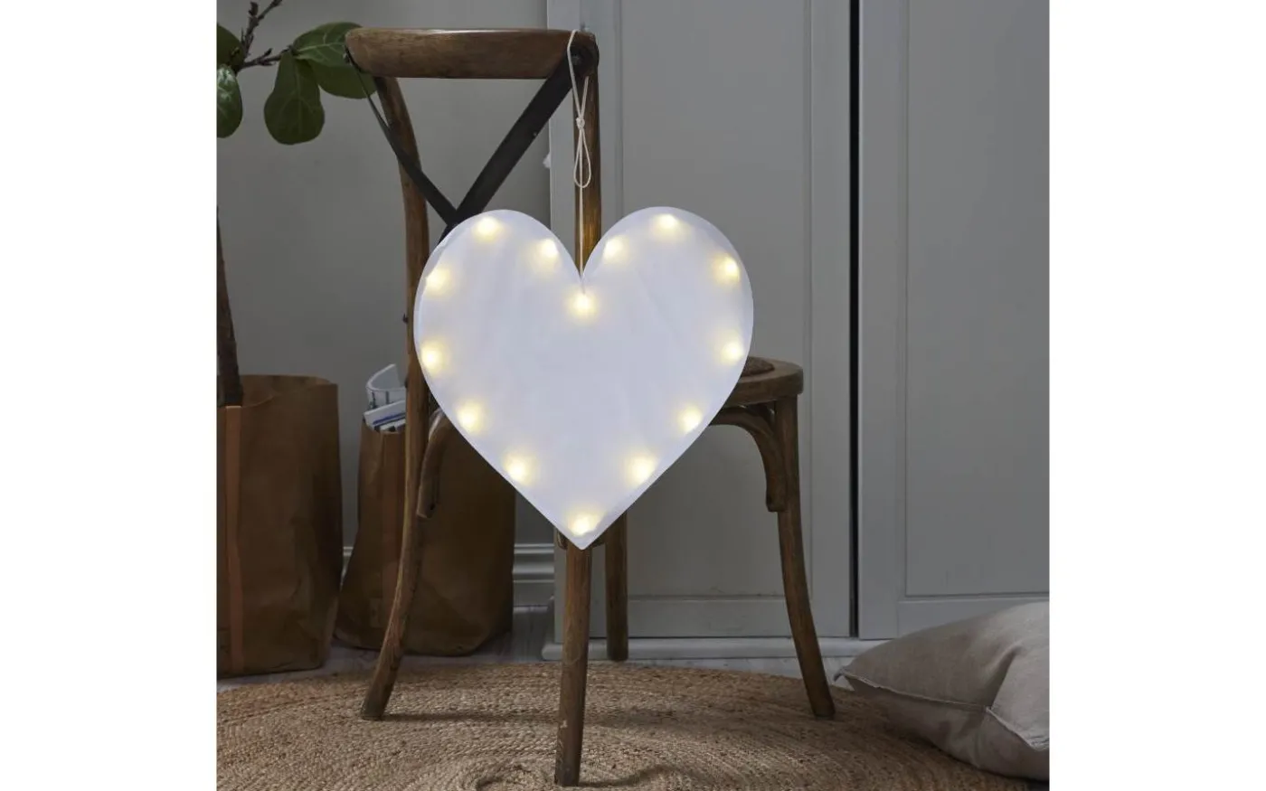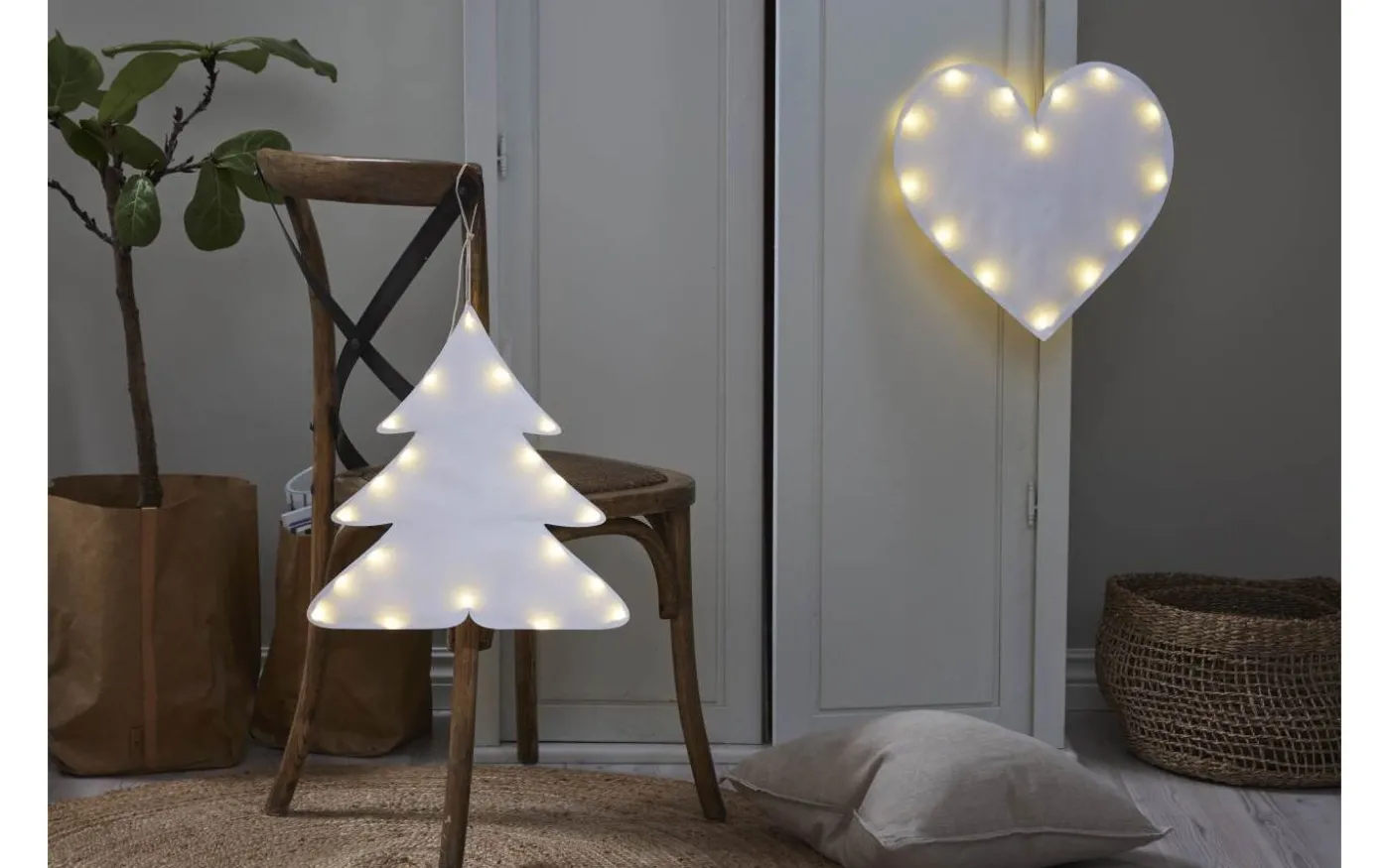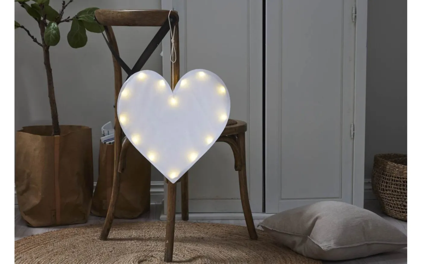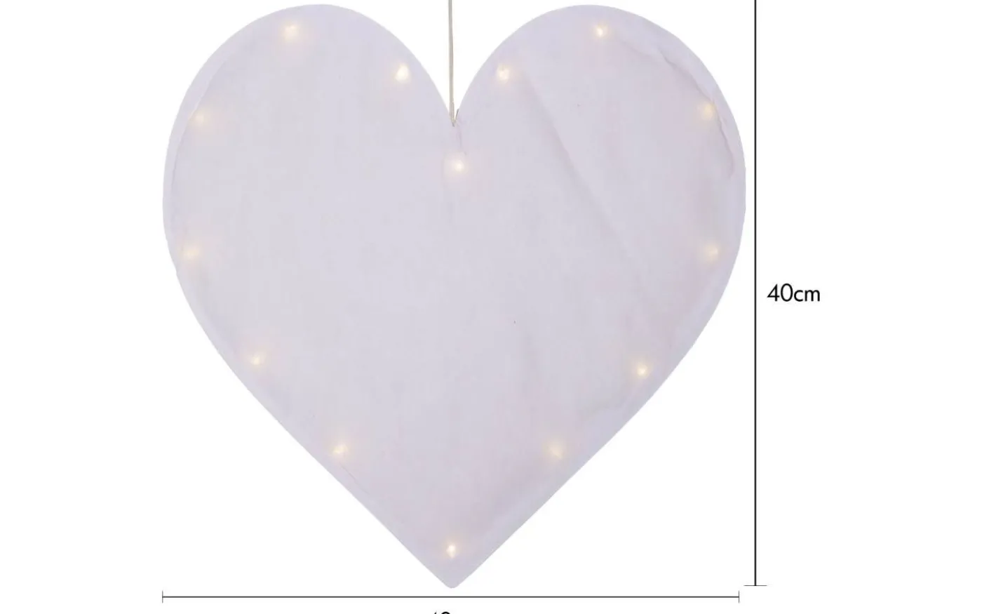 Vitt hjärta i papper. Hjärtat är lätt vadderat och lyser med små LED- punkter. En stilren dekoration som lyser dubbelsidigt. Häng den i ett fönster, mot en dörr eller spegel. Kan med lätthet placeras på många ställen i hemmet och skapa en mysig stämning. Produkten drivs av batteri och har timer. 3 batterier AA ingår ej.