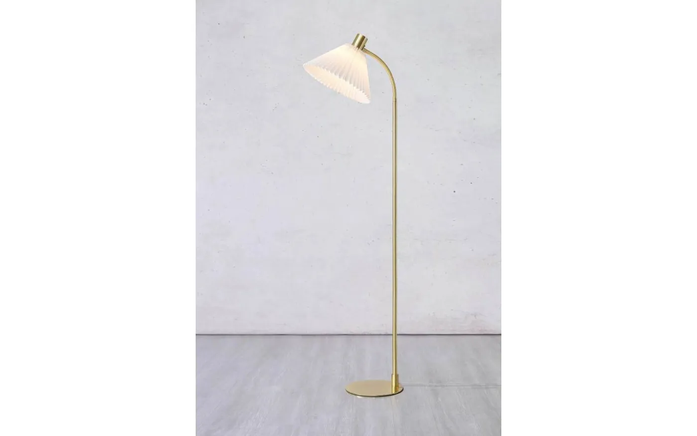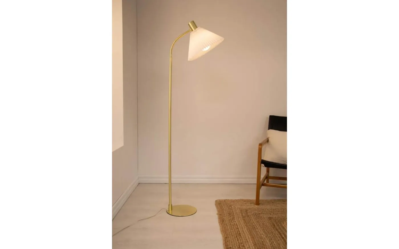 Mira golvlampa från Markslöjd har en mässingsfärgad lampfot i metall kombinerad med en vackert veckad lampskärm i vitt tyg. Strömbrytaren sitter på lamphuvudet och lampans arm är böjbart upptill. Detta är en golvlampa som går åt det moderna, klassiska hållet. Perfekt att placera vid favoritplatsen i soffan eller fåtöljen!