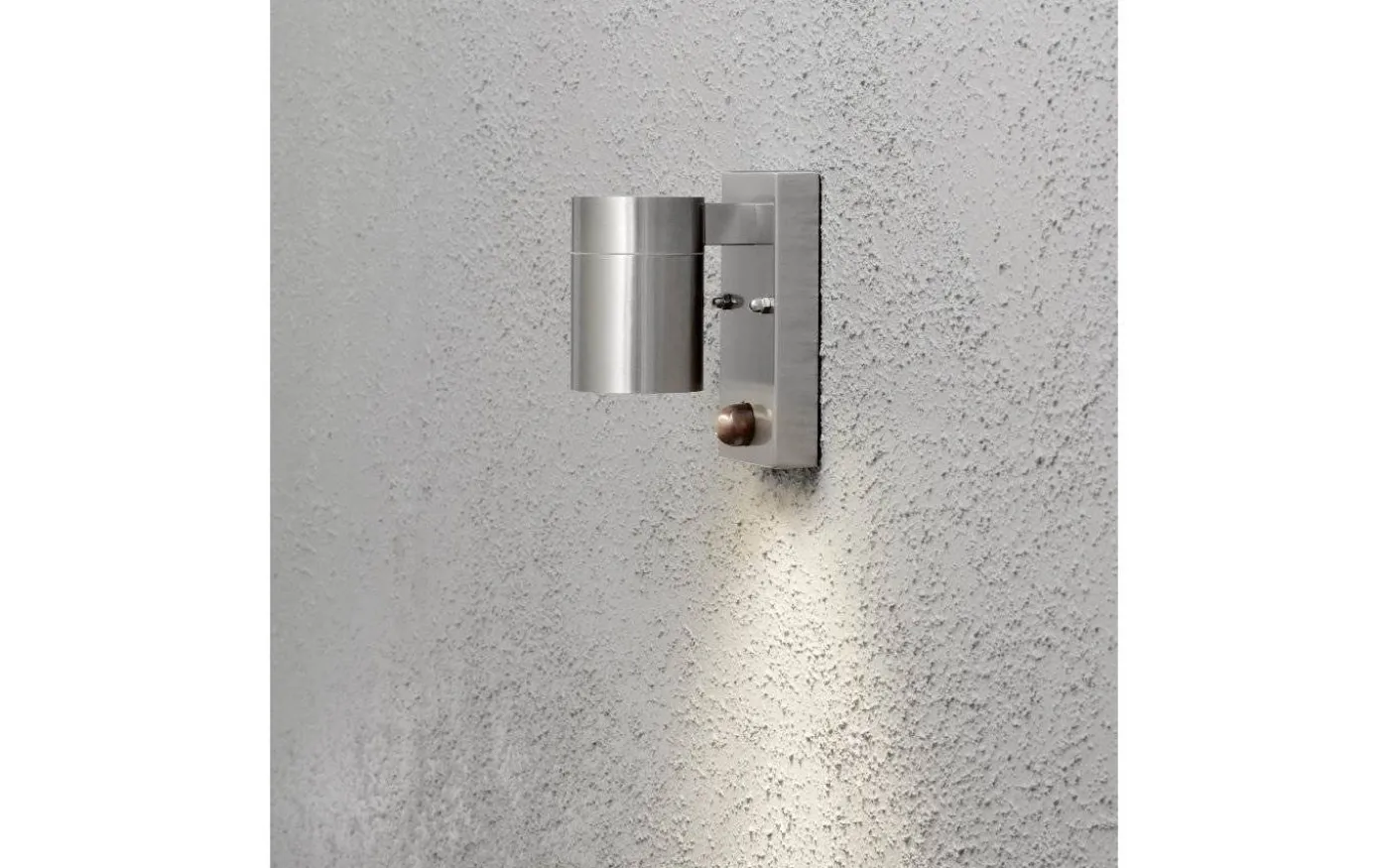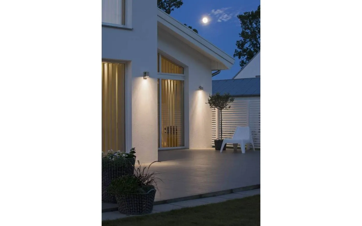 Denna högkvalitativa vägglampa är tillverkad av rostfritt stål och klart glas. Modena har inbyggd rörelsevakt och avger ett behagligt och bländfritt ljus som reflekteras nedåt och avger en vacker ljusbild på din fasad. Smidig installation med 230V.