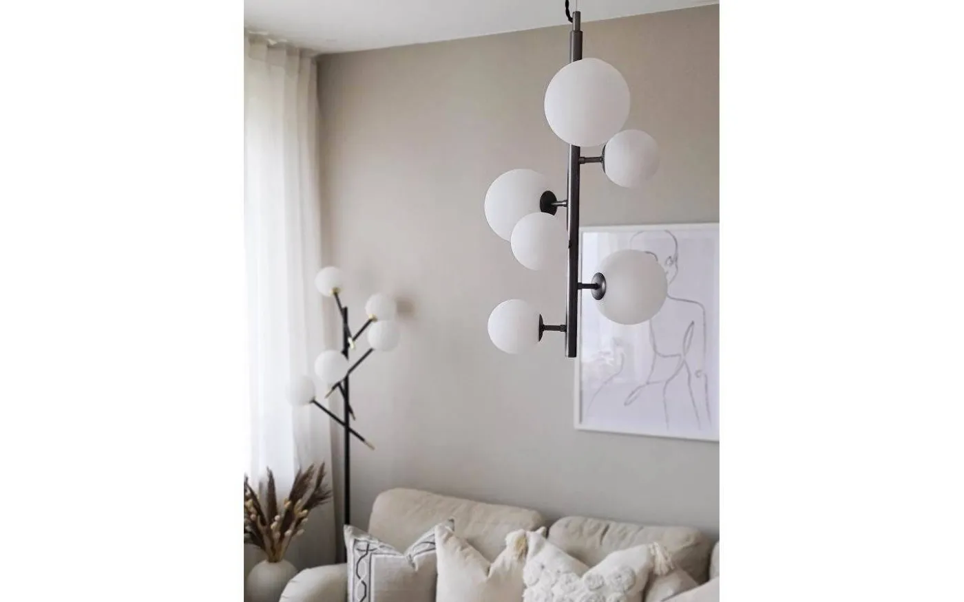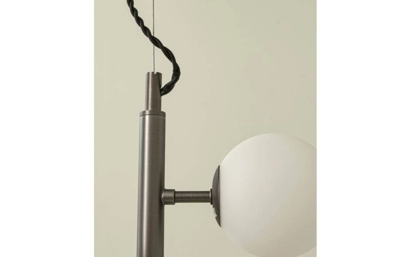MOLEKYL modern snygg taklampa i tenn med 7 vita glaskupor i två olika storlekar. 7 x 25W G9 (ingår ej). Hänger i justerbar vajer. Krokupphäng med takkopp i tenn.