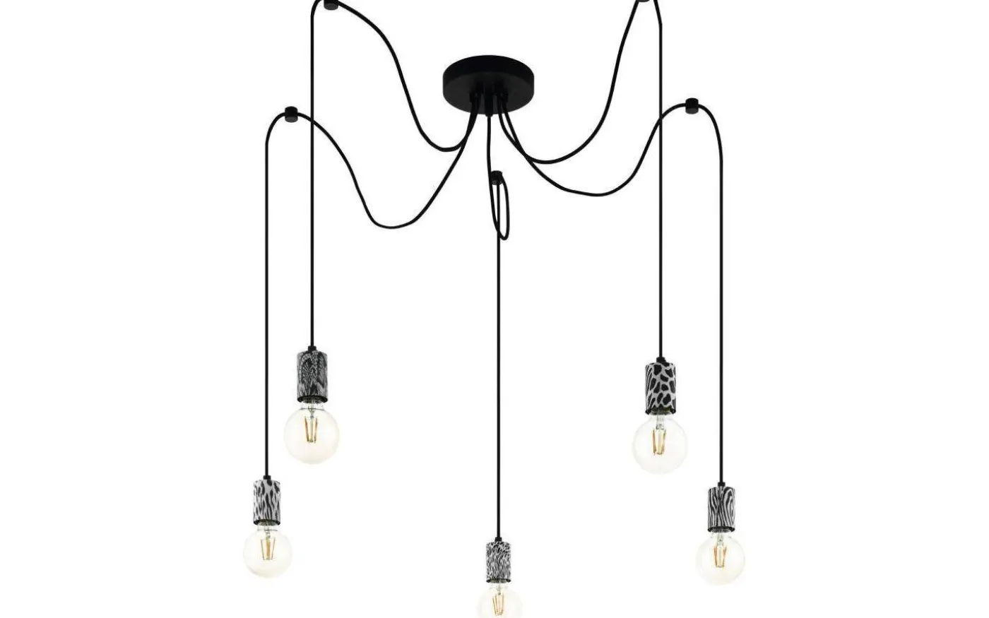 Nagpur taklampa från Eglo är en tuff taklampa som består av en central takbas med fem nedpendlade lamphållare i stål med djuriskt mönster. Den svarta takkoppen fäster du direkt i taket och du bestämmer själv vart de olika sladdarna ska hänga (metallfäste till varje sladd som skruvas upp).
