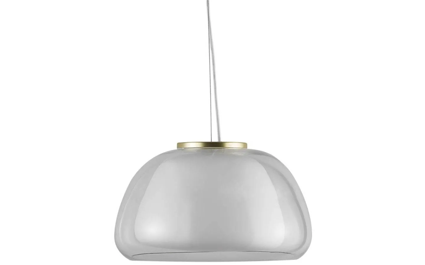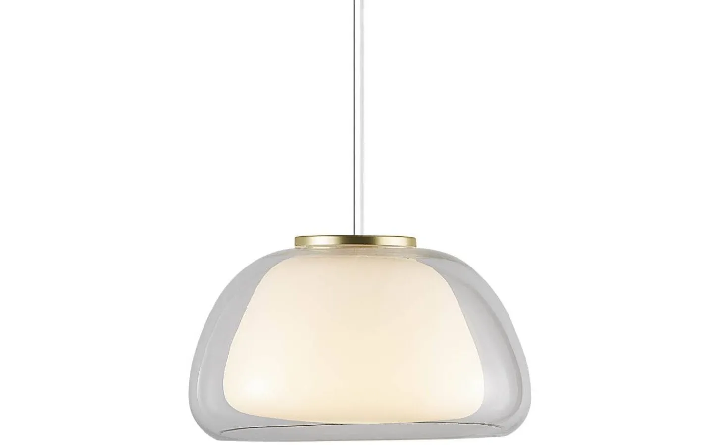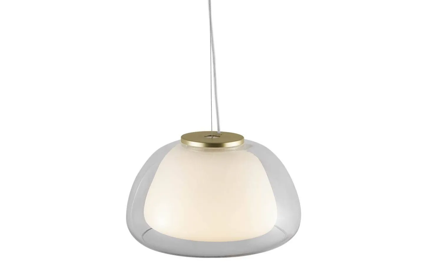 Jelly taklampa från danska Nordlux består av två lager glas med den inre skärmen i vitt opalglas och den yttre i klarglas, vilket tillsammans ger ljuset ett mjukt och varmt sken. En liten detalj är det fina mässingshöljet som ger pendeln ett exklusivt uttryck.