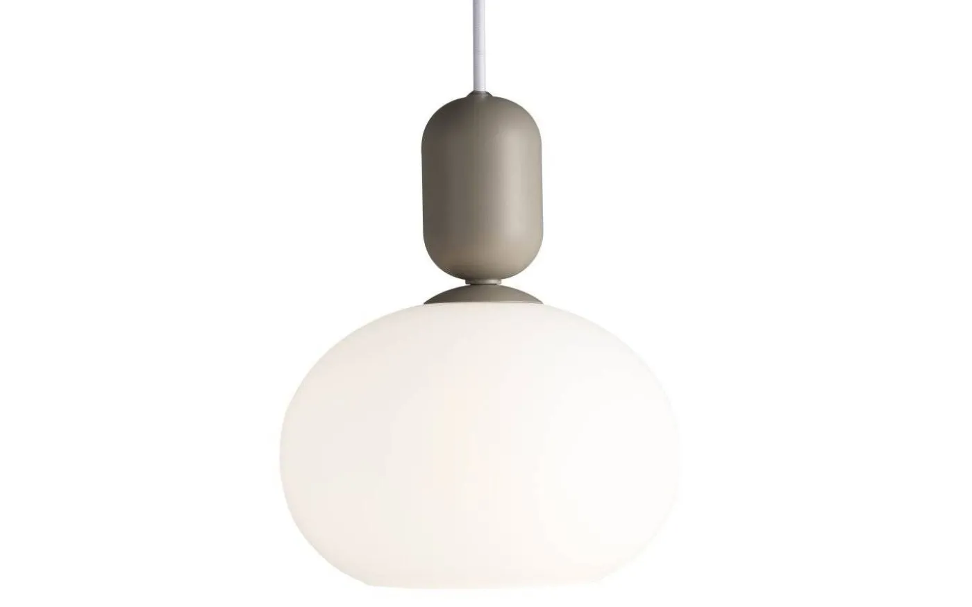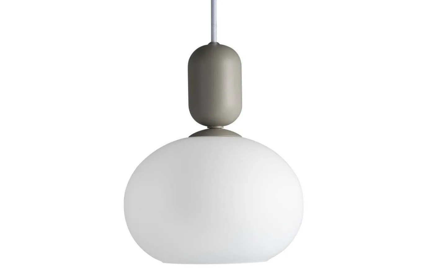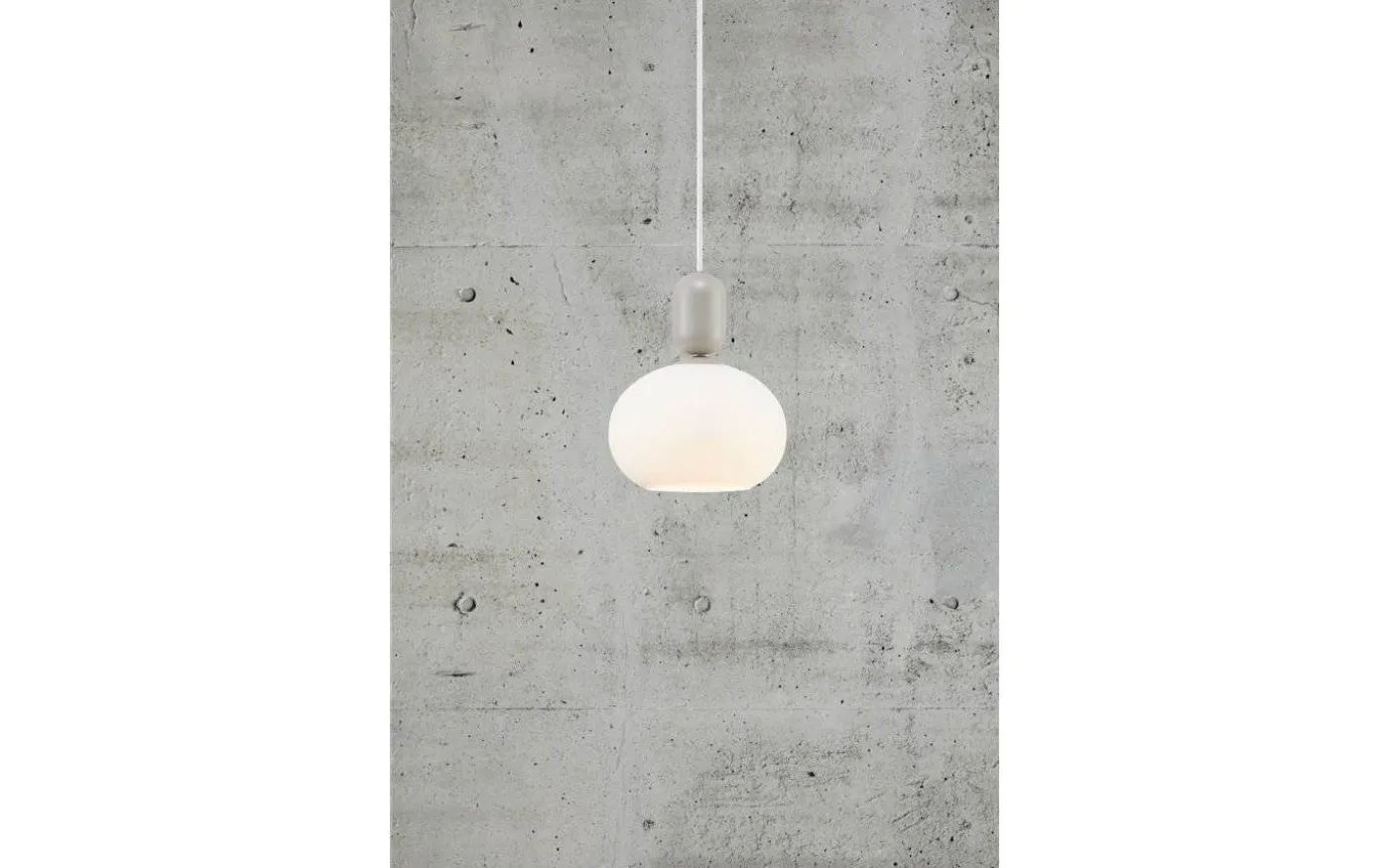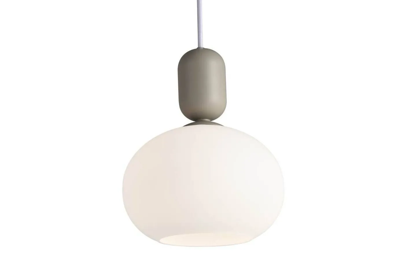Notti taklampa från danska Nordlux. De fina formerna återspeglar en elegant design. Den stora kupolformade glasskärmen i opalvitt glas utgör en fin kontrast till den lätta metallsockeln som bidrar till visuell volym och ett mjukt ljus.