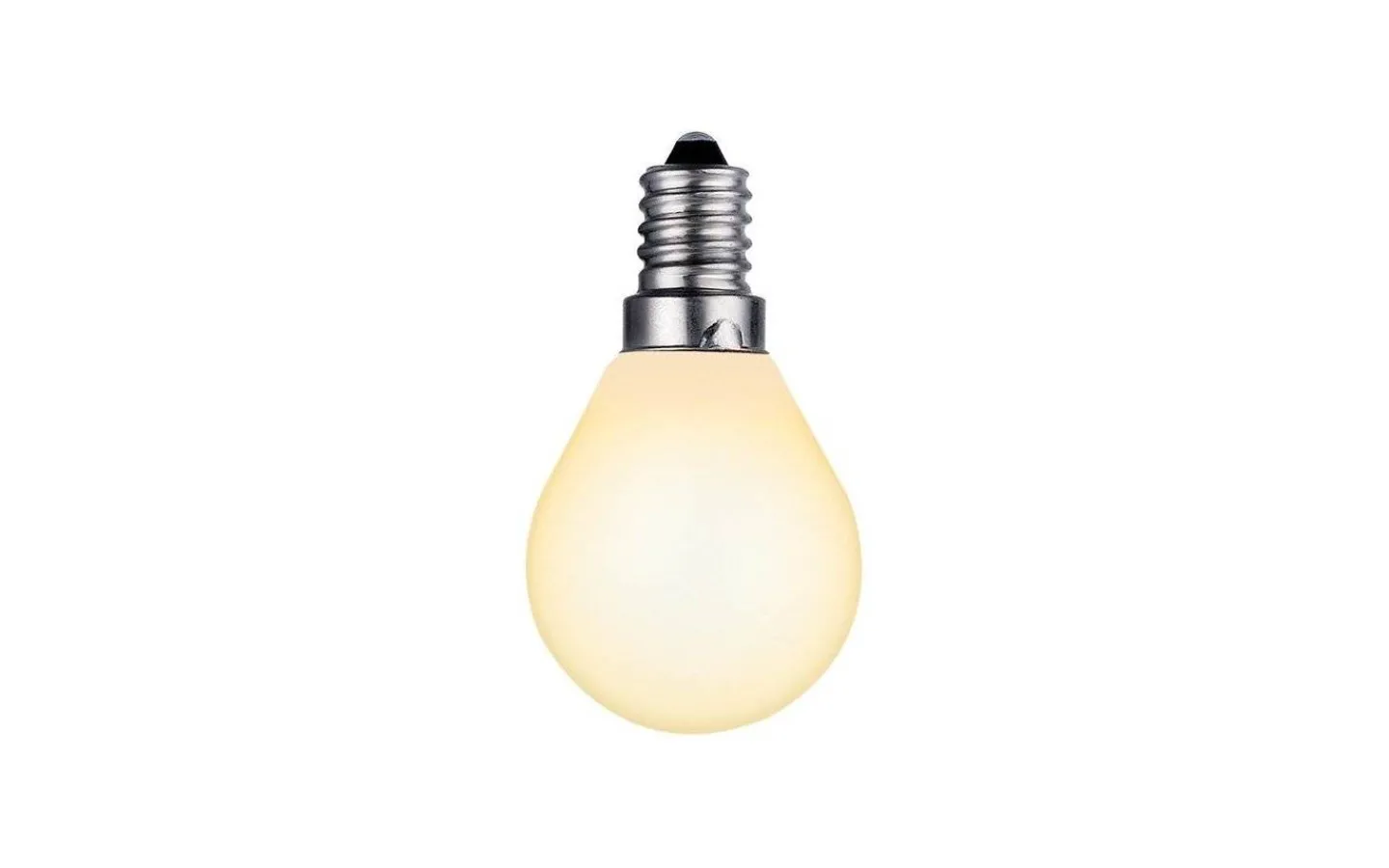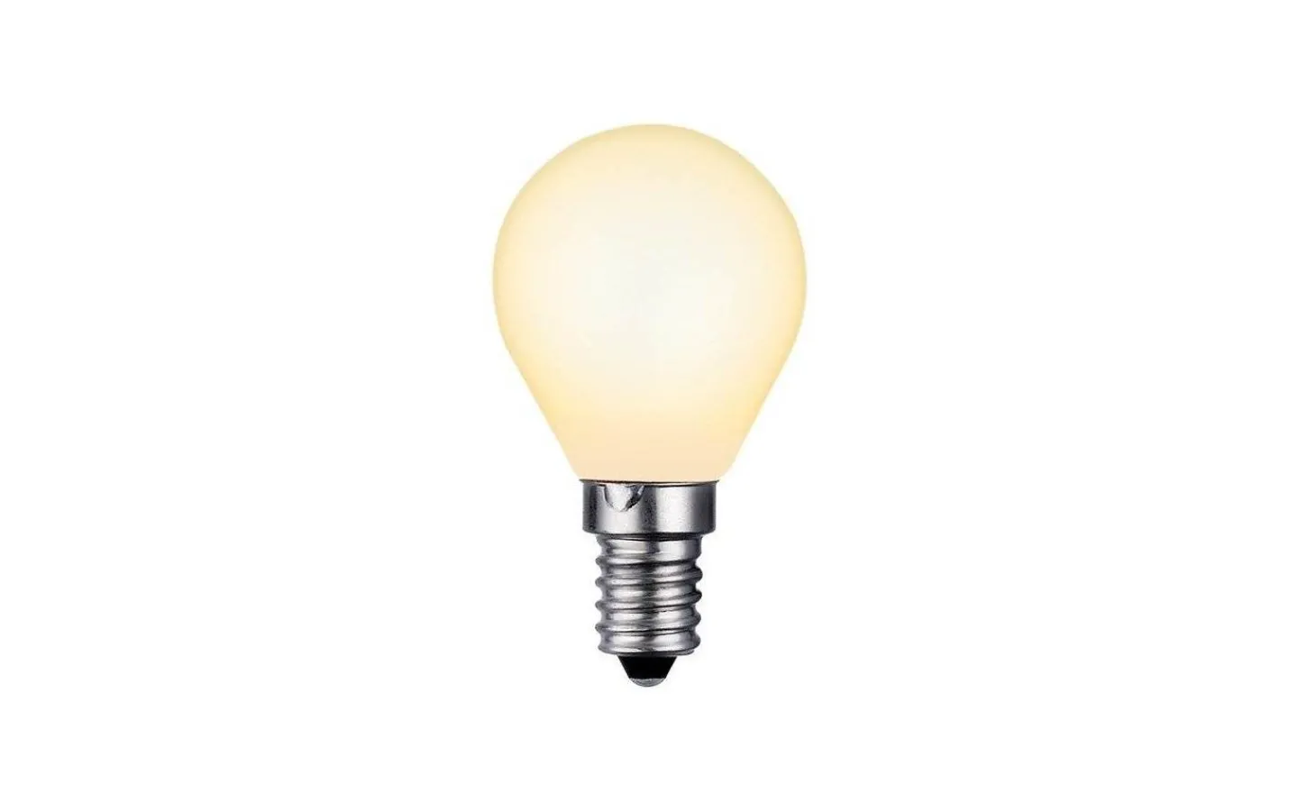Klotformad opal LED-lampa med E14 sockel. Ljuskällan avger ett varmvitt ljussken och har en ljusstyrka på 350 lumen vilket motsvarar ungefär 30W glödljus.