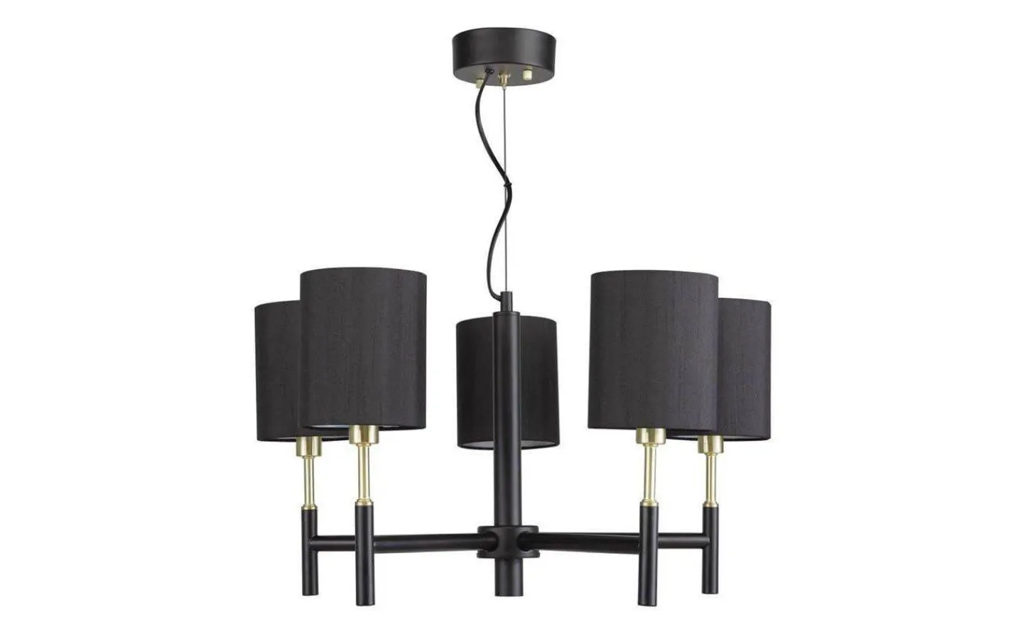 Berlin taklampa från Oriva är en elegant taklampa i svart metall med mässingsfärgade detaljer. På de fem lamparmarna sitter en matchande svar lampskärm.