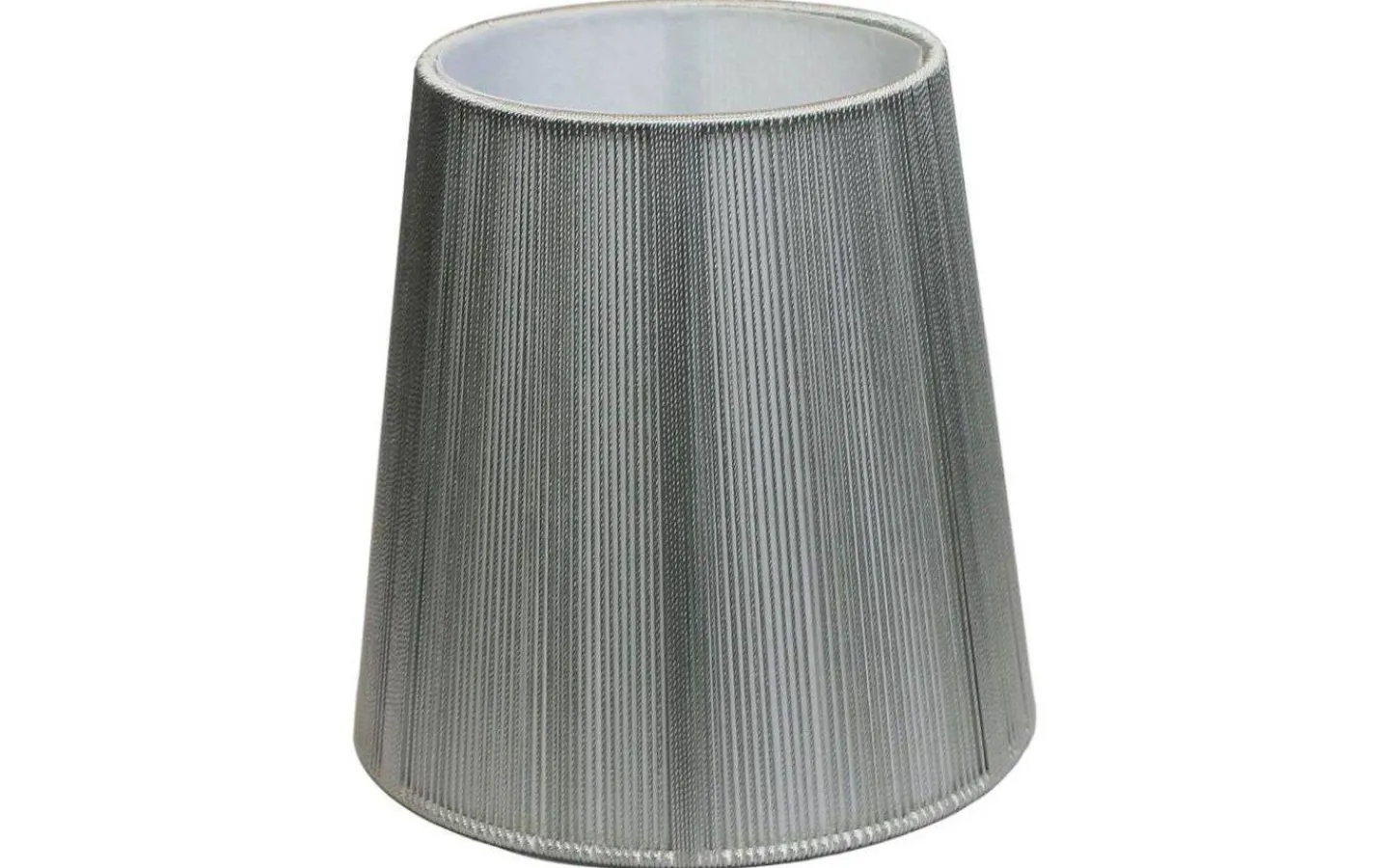 Snöre lampskärm från Oriva är i bomull med snörat mönster. Lampskärmen har klofäste som fäst på en klotformad ljuskälla.