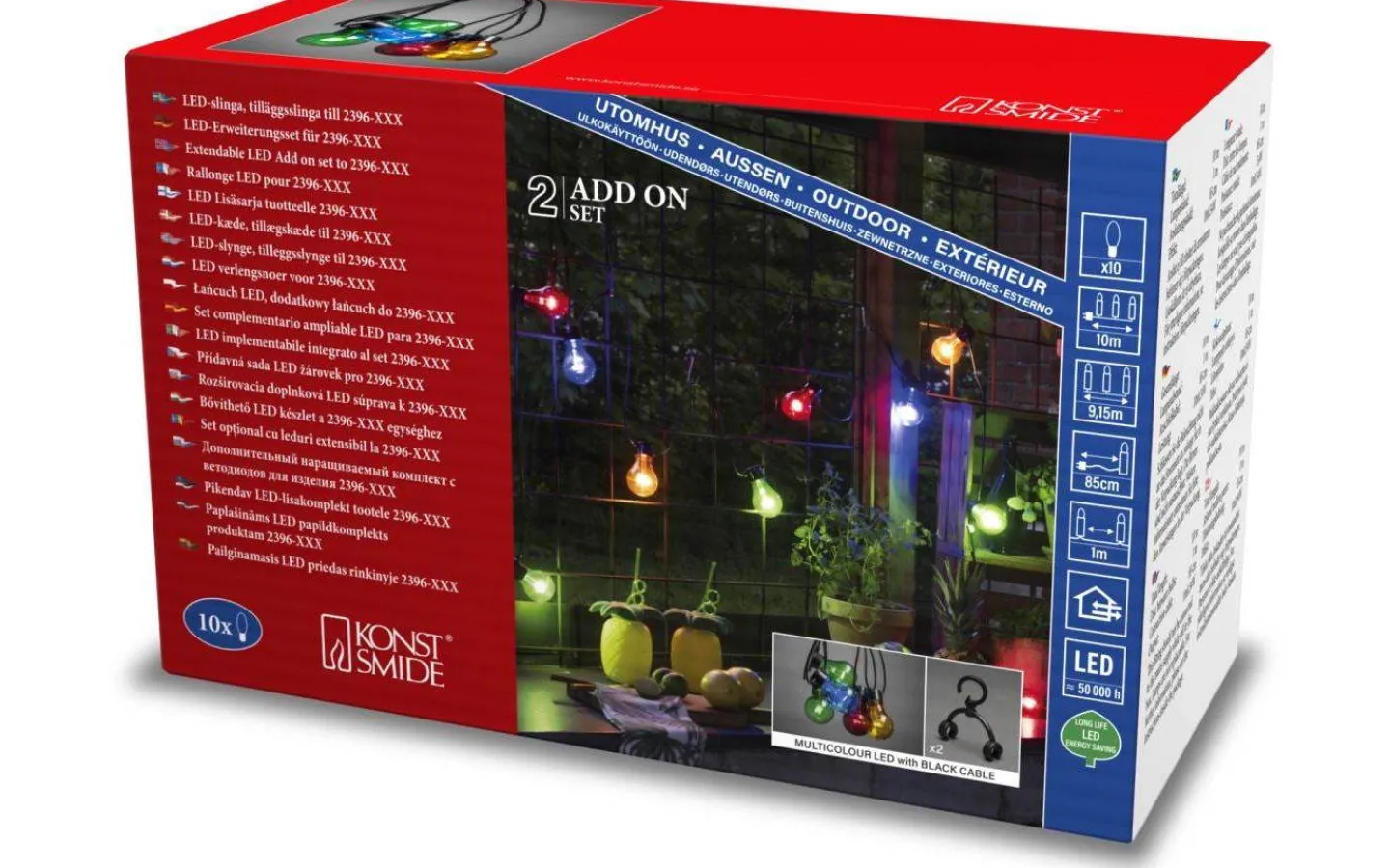 9,2m lång extra ljusslinga till Partyslinga 9,2m från Konstsmide. Denna slinga är ett extra tillbehör och kan endast kopplas ihop med Start paketet. Detta finner du under ”Tillbehör”.