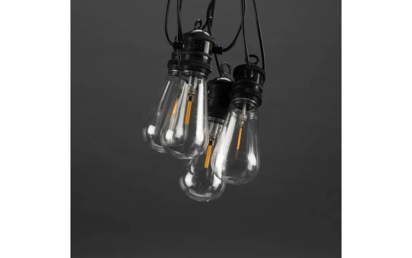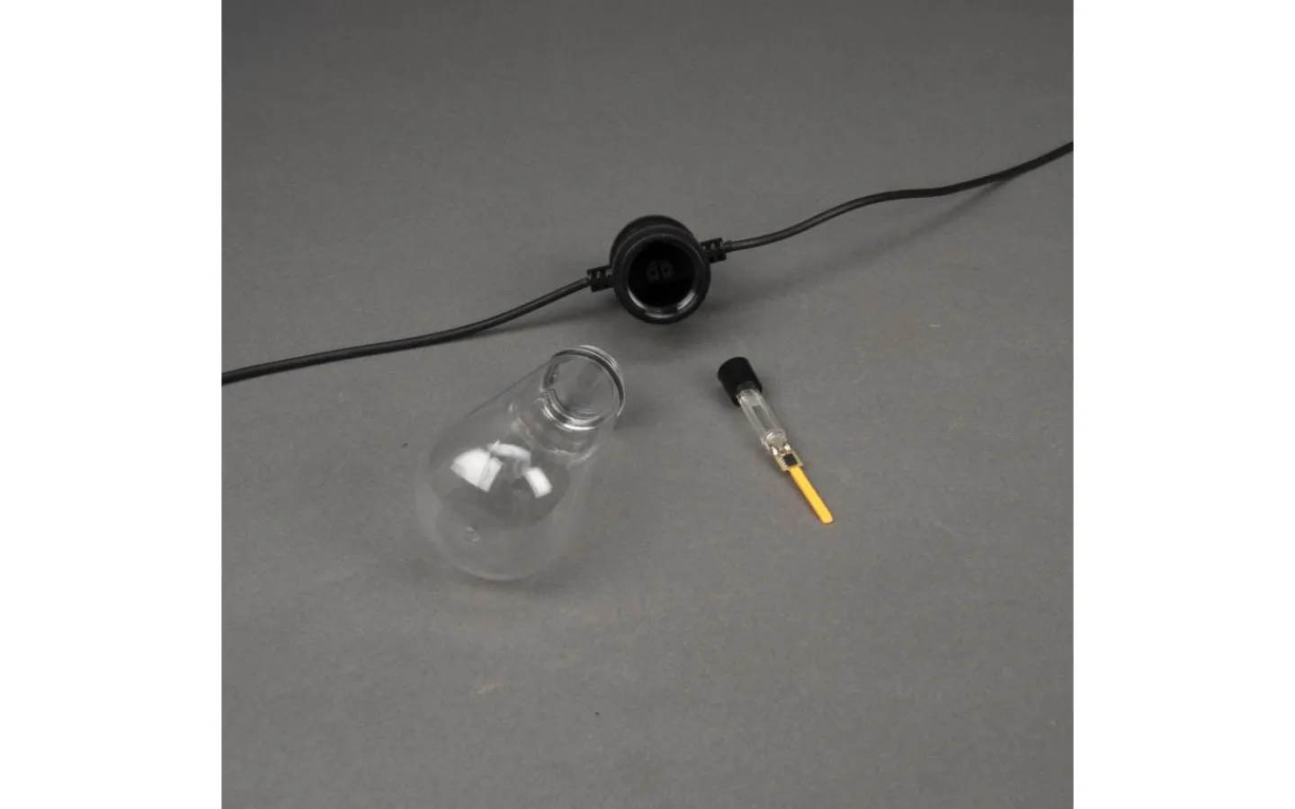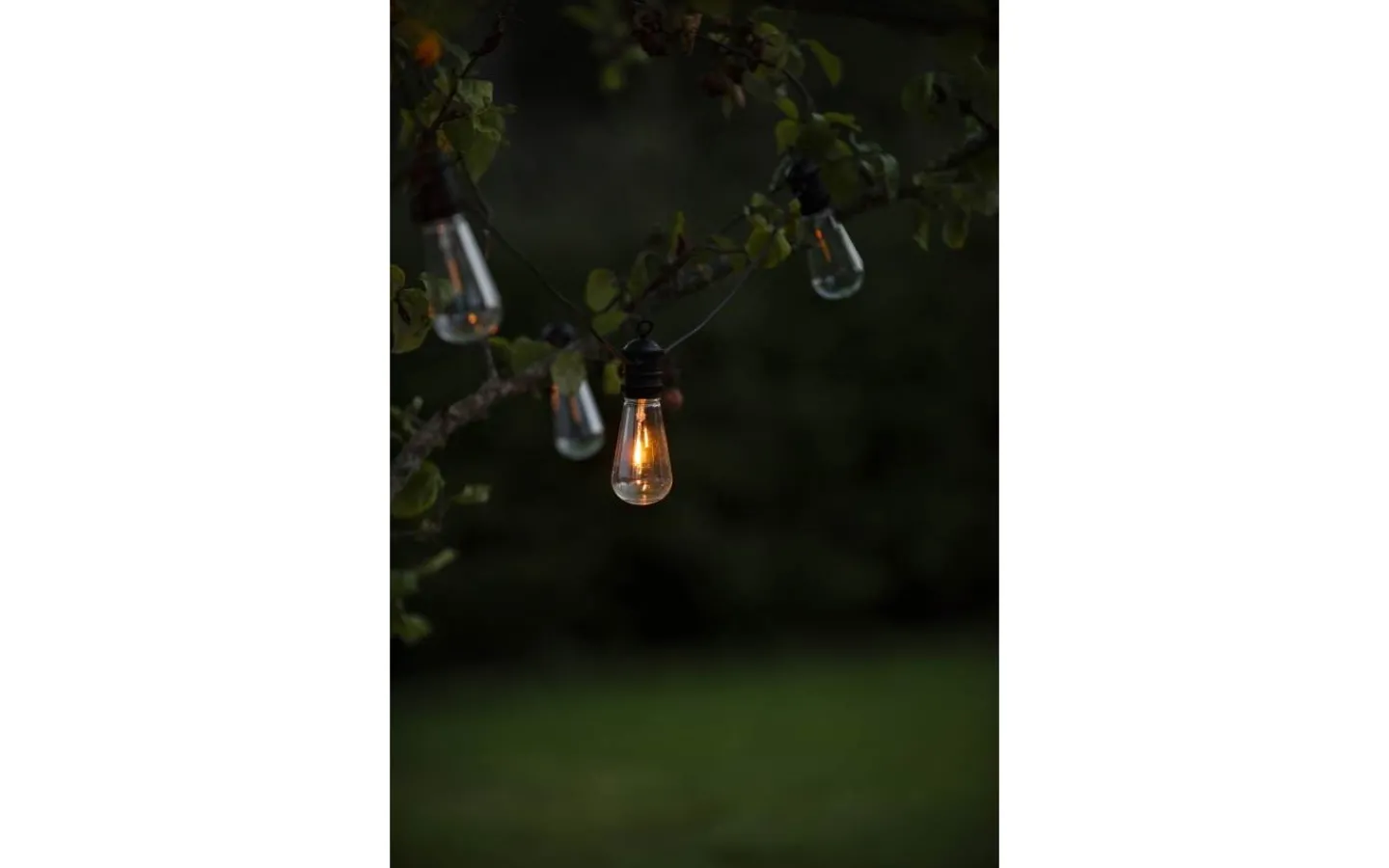 Partyslinga för uteplatsen eller förtältet, med 10 st amberfärgade och utbytbara LED lampor med vattendropp effekt. E27. Lampavståndet är 50 centimeter. Anslutningssladden är 10 meter vilket ger en totallängd på 14,5 meter.