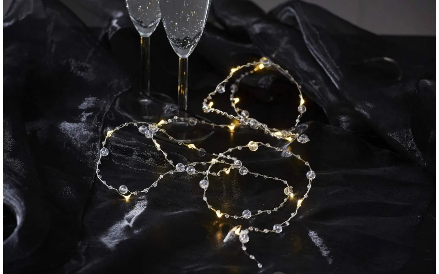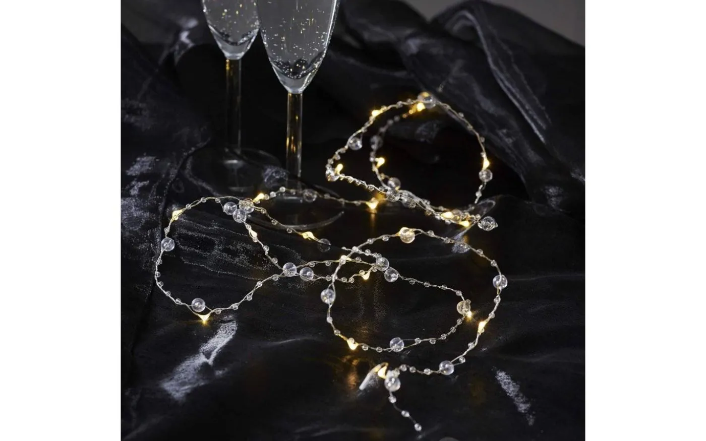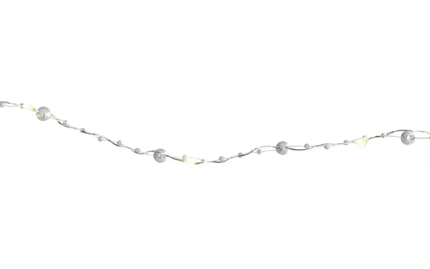 Vacker ljusslinga i silver dekorerad med små, transparenta pärlor och fina lampor som sprider ett härligt, varmvitt ljussken. Ljusslingan passar att dekorera med i växter, i fönsterkarmen eller på matbordet för att piffa till en vacker middagsbjudning.