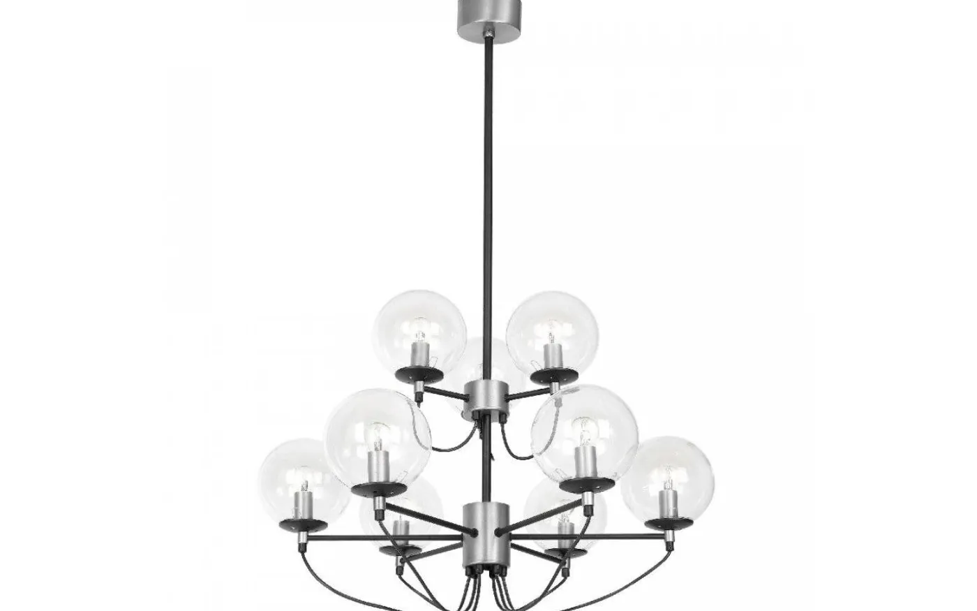 Lampan har stomme i svart metall med detaljer i borstad silver kombinerat med 9 runda glaskupor i klarglas. De synliga, svarta kablarna ger lampan ett modernt och industriellt uttryck och blir en härlig kontrast till den eleganta mässingen. Varje glas har en diameter på 16 cm.