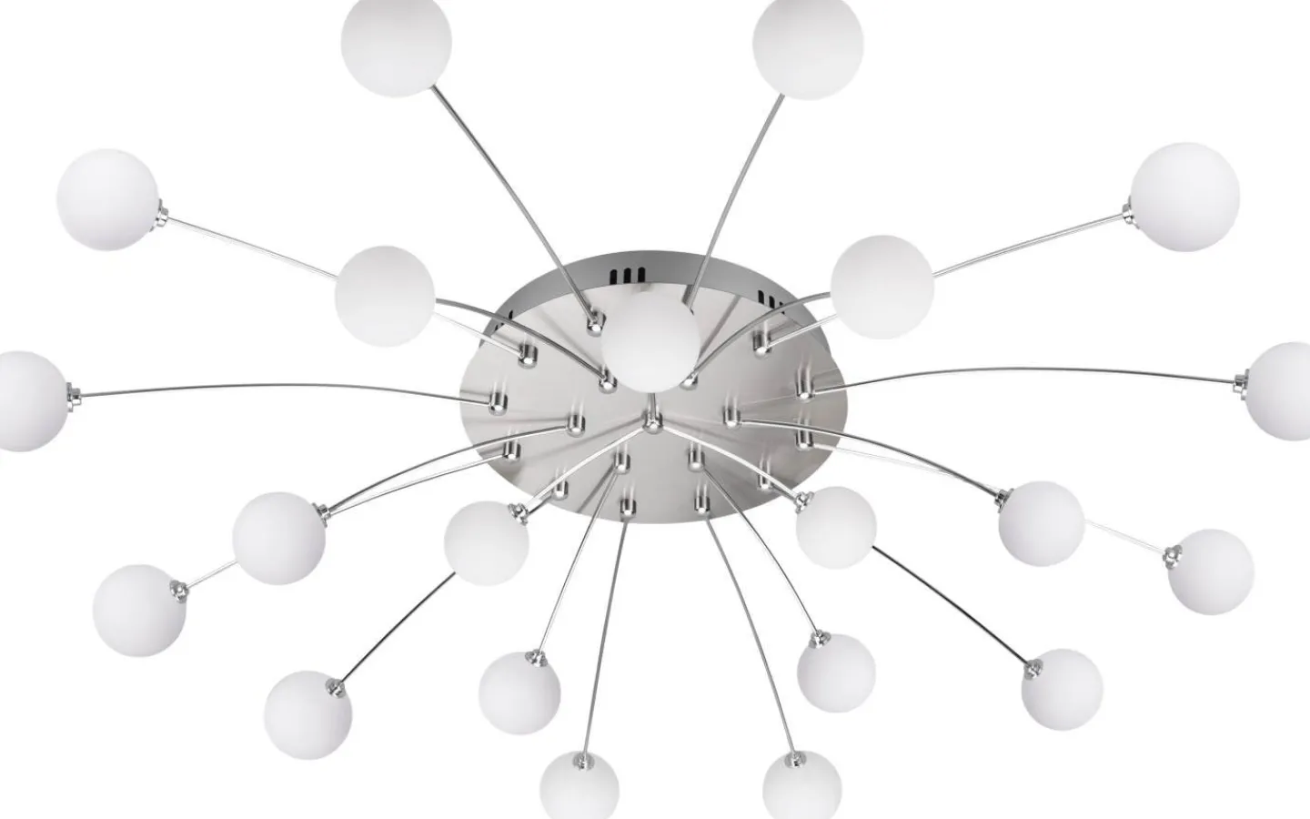 Den som letar efter dekorativ belysning kommer att bli begeistrad av BULLET. Tack vare sin iögonfallande design passar taklampan perfekt som ett dekorativt element och ger spännande ljusaccenter. Den integrerade SWITCH-dimmern gör det också möjligt att gradera ljusstyrkan från 100 % till 50 % och 25 % via en vanlig ljusströmbrytare. Tack vare färgdesignen i matt nickel i kombination med vita glasskärmar ger armaturen ett modernt utseende som kan integreras i nästan alla inredningsstilar. Dessutom har armaturerna modern LED-teknik, vilket står för hög ljuskvalitet. LED-ljuskällor kännetecknas av lång livslängd och låg värmeutveckling. Ljuskälla: inklusive 21x SMD, 1,5W · 21x 170lm, 3000K. Extra information: Takmontering, IP20, Ej lämplig för extern dimmer, Dimbar via strömbrytare