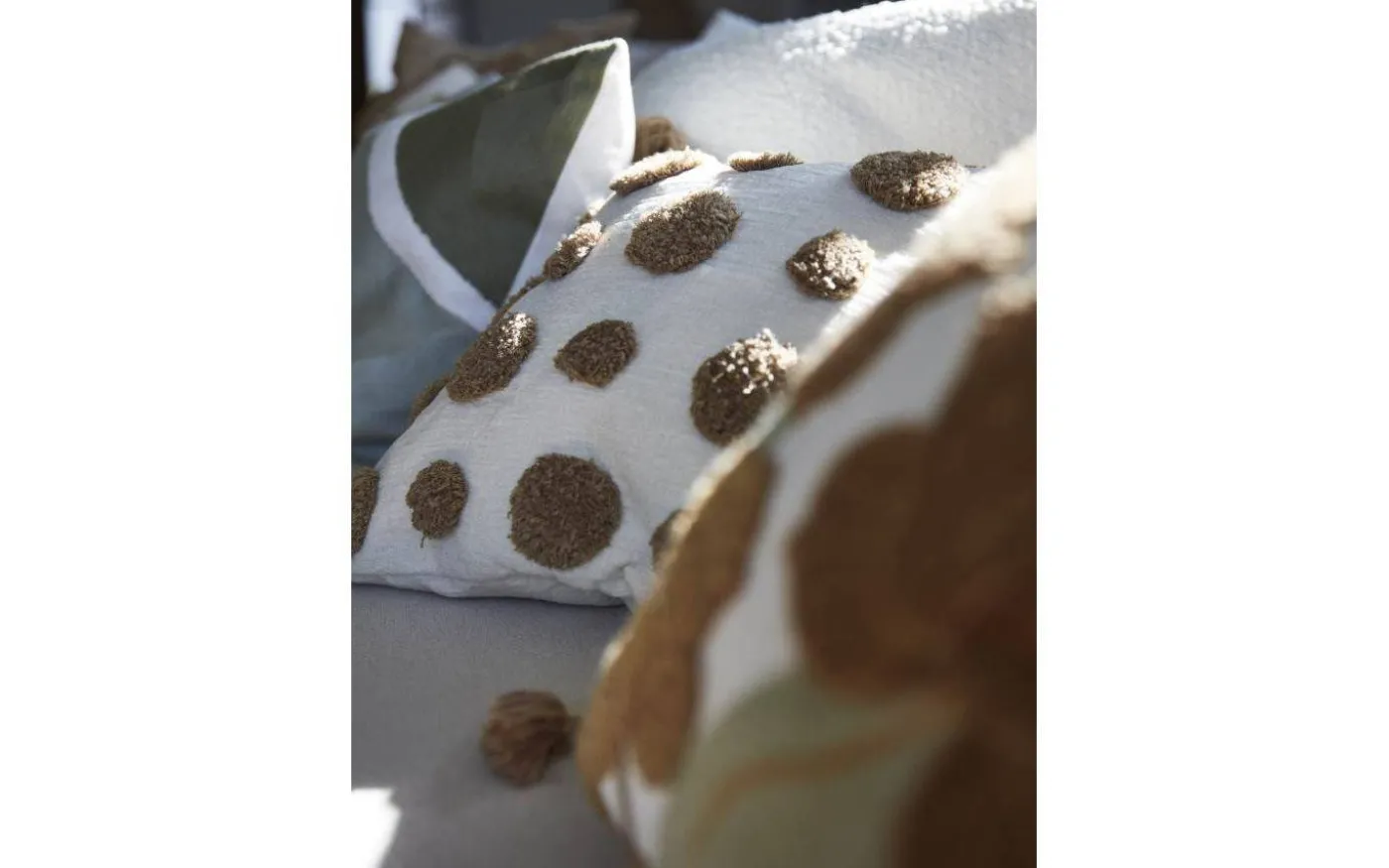 Pom kuddfodral från Svanefors med tuftat mönster på framsidan och med tofsar i hörnen. Kuddfodralet har måttet 45×45 cm och har dragkedja i nederkant.