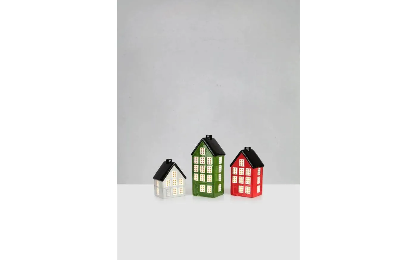 Portree bordsdekoration från Markslöjd. 3-set hus i keramik. Höjd på hus, grönt 24,5cm, rött 19,5cm och vitt 14,5cm. Inkluderat fjärrstyrda LED värmeljus i 3-pack. Uppladdningsbara värmeljus i plast. 2,4,6 och 8h timerfunktion. Ställbar ljuseffekt, konstant eller flamma. Konstant ljus i 4st dimbara steg. 1m vit USB-C sladd medföljer. Brytare under varje ljus.