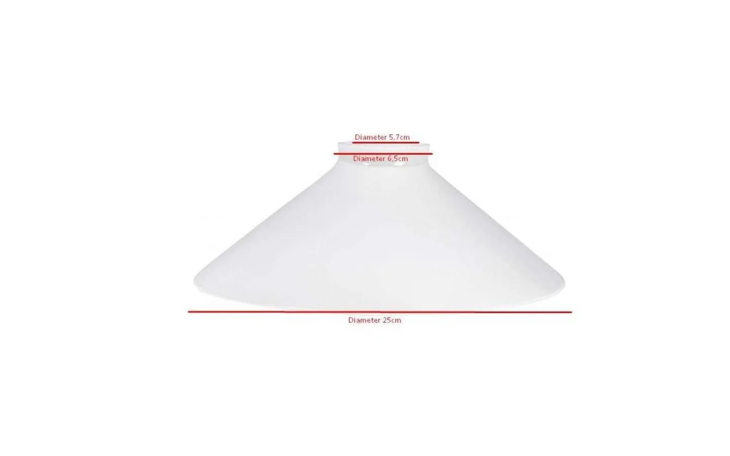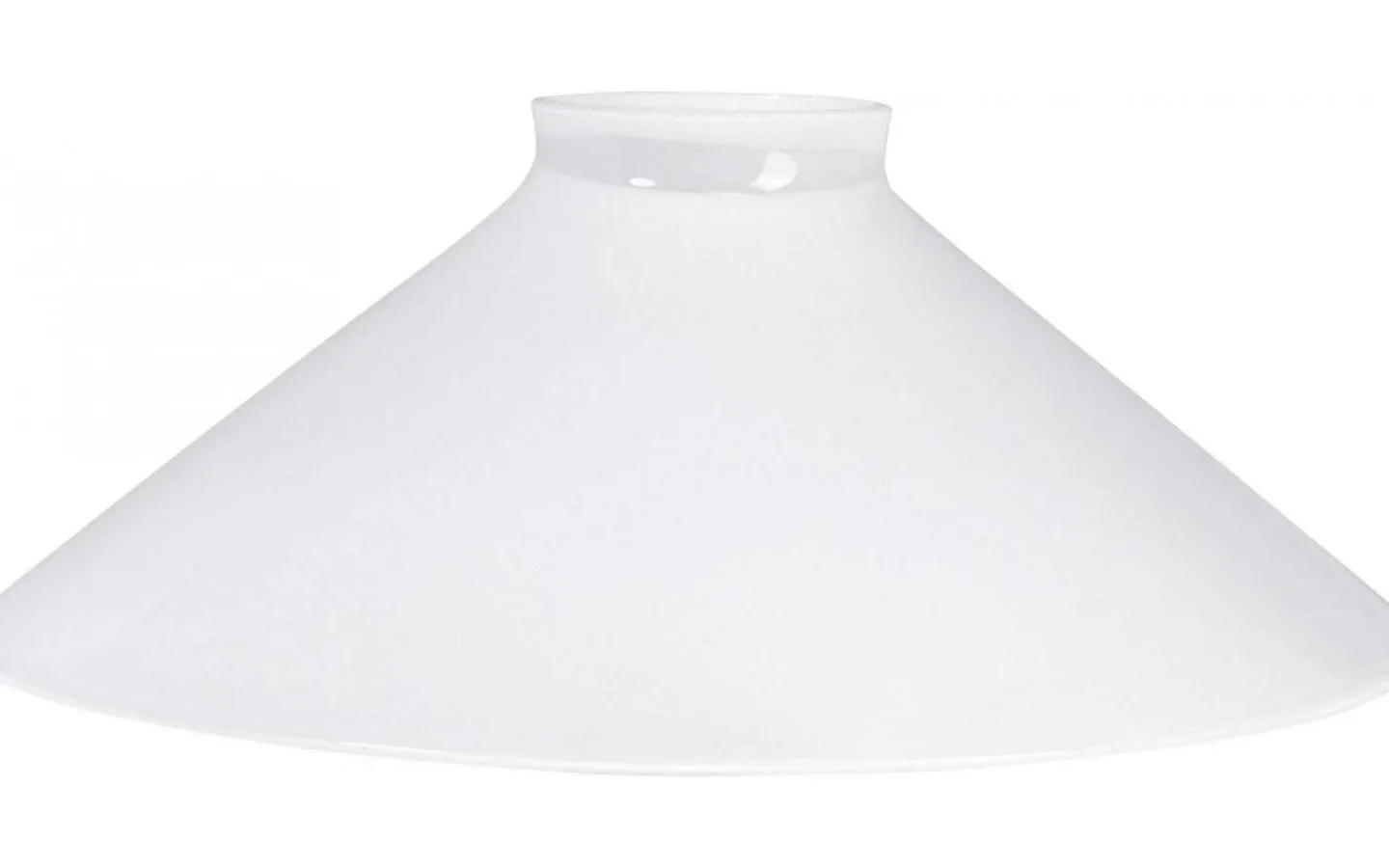 Skärm i vitt glas till klassisk skomakarlampa, från PR Home. Glasets diameter är 25 cm på bredaste stället. Diameter på hålet på ovansida skärm är innermått 5,7 cm och yttermått 6,5 cm.