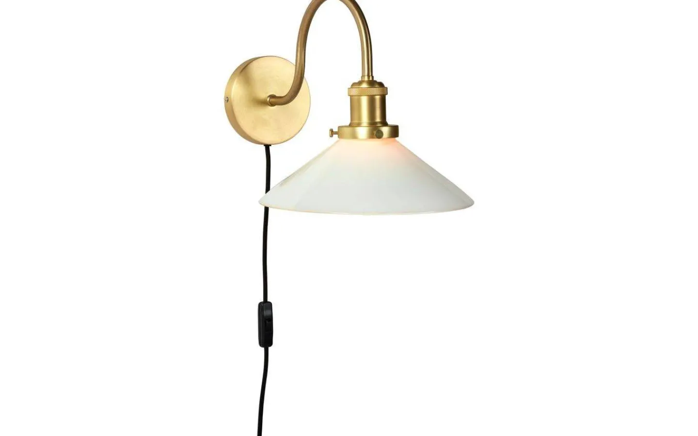 Axel vägglampa från PR Home har en klassisk rundad båge av metall i mässingsfinish med en opalvit glasskärm som ger ett fantastiskt sken och skapar ett vackert blickfång. Glasskärmen monteras på metallbågen med tre stycken skruvar som i sig utgör en vacker detalj och förhöjer den klassiska känslan.