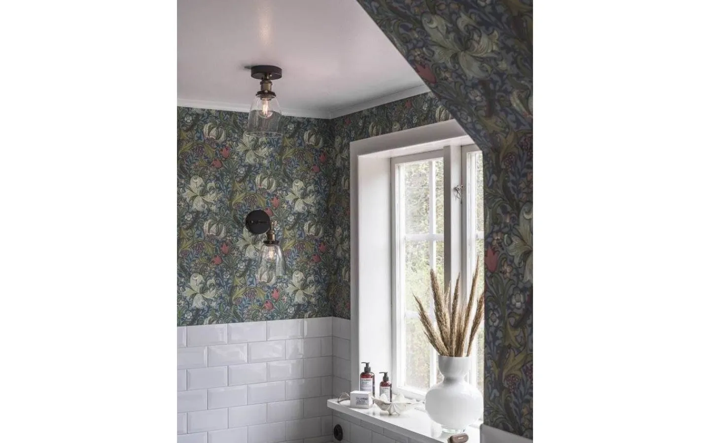 Lampbda vägglampa från PR Home är i klassisk design med klarglas och metallchassi i mattsvart/mässing ytfinish.