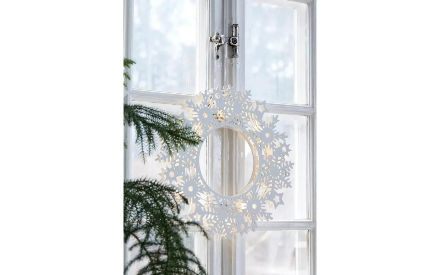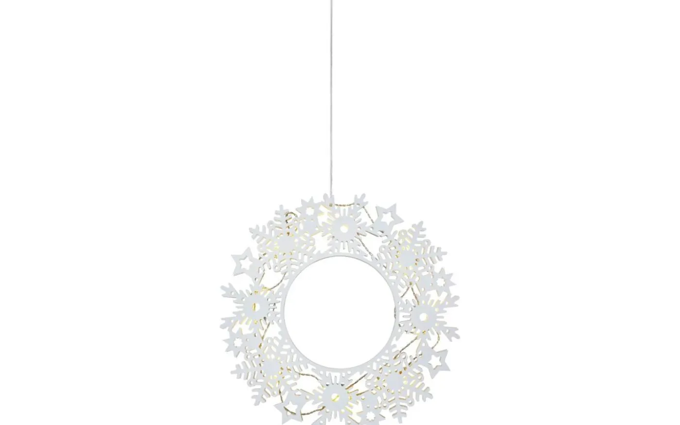 Juldekoration av snöflingor av plast. Fast LED-belysning med 16 ljus som belyser kransen inifrån. Diameter på 35cm. Vi rekommenderar: Med sin batteridrift kan den hängas vart som helst. På krok, i fönster eller i ett mörkt hörn. Tekniskt: Lampan har fast LED-belysning med 16 ljus om 0,96W. Drivs av tre AA-batterier, ingår ej. Timer och strömbrytare på batteribox.