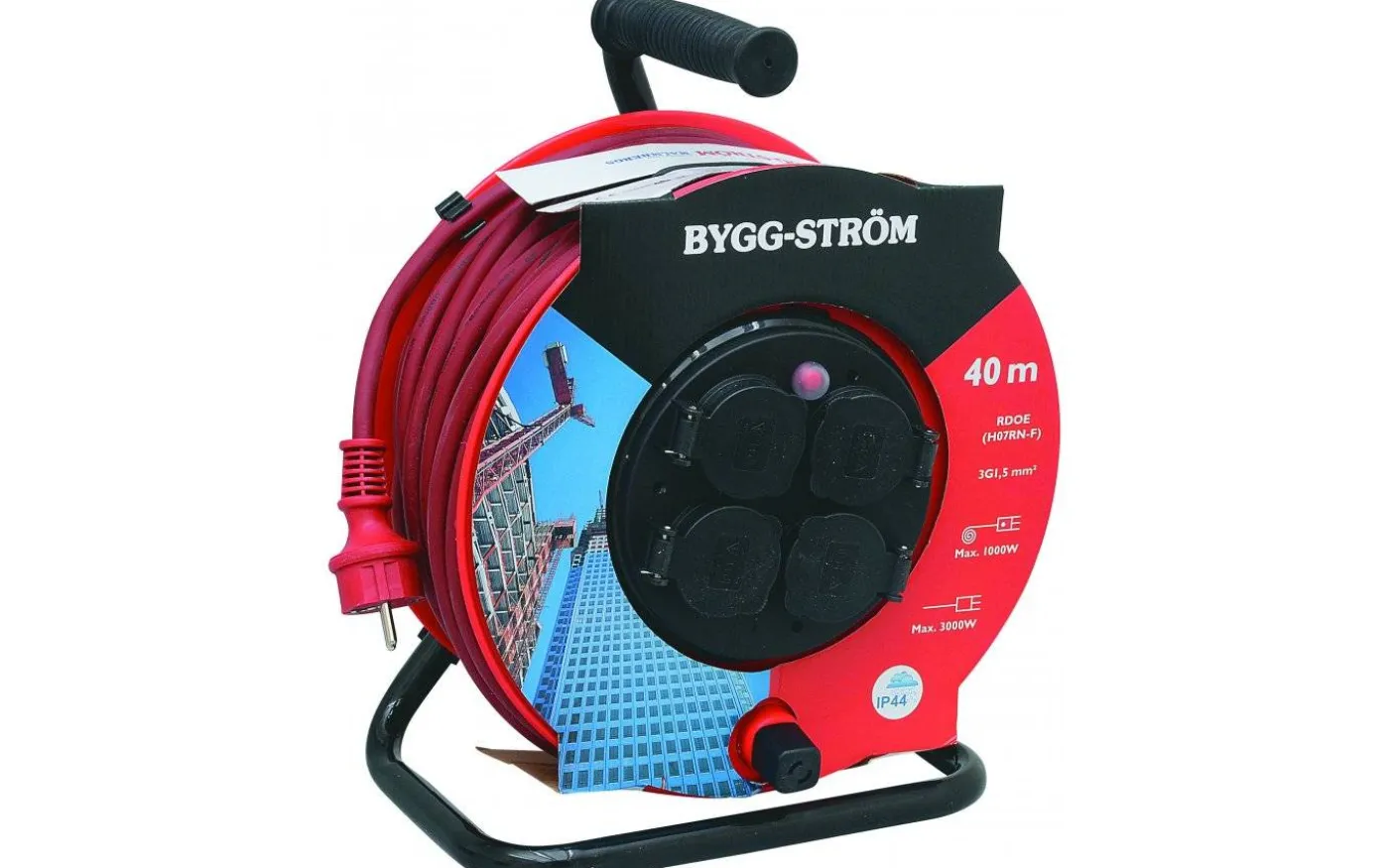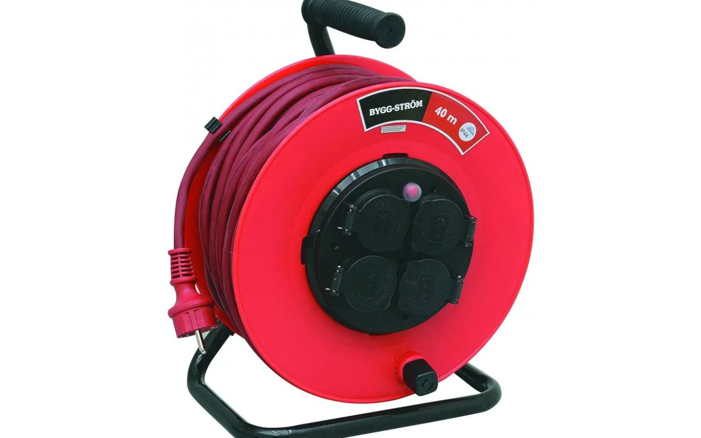 Kabelvinda med anti-twistfunktion för trasselfri hantering av anslutna kablar. Röd högflexibel och oljebeständig gummikabel gör att den syns tydligt. Rejält stativ och vinda av slagtålig plast för användning på byggarbetsplatser m.m. Överhettningsskydd och jordade uttag med lock.