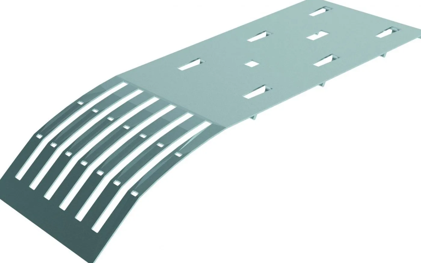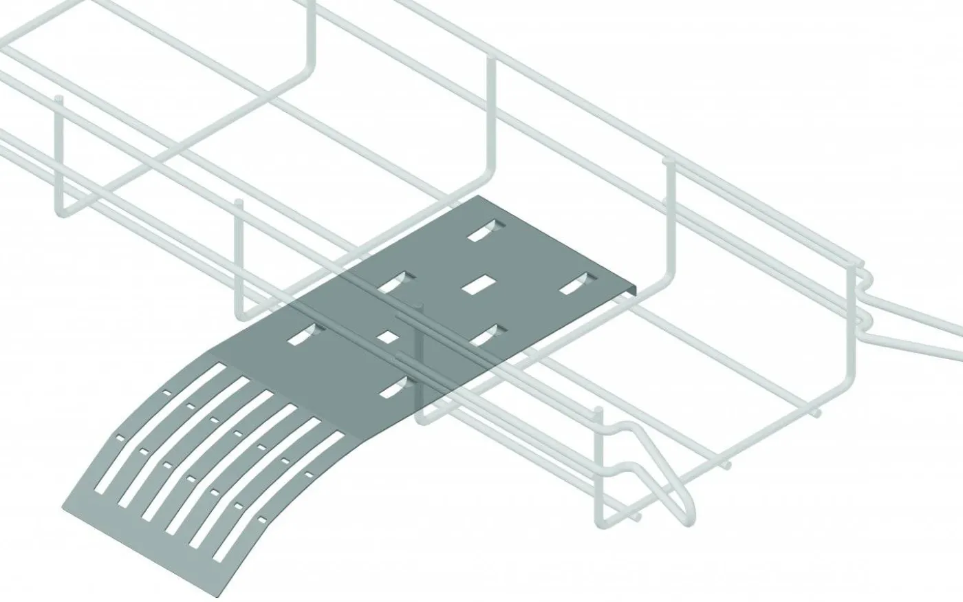 Plåt med slitsar för att avlasta och bibehålla minsta böjningsradie på kablar där man går från stege till vägg. Plåten låses mot trådstegen med klämmor som böjs ned.
