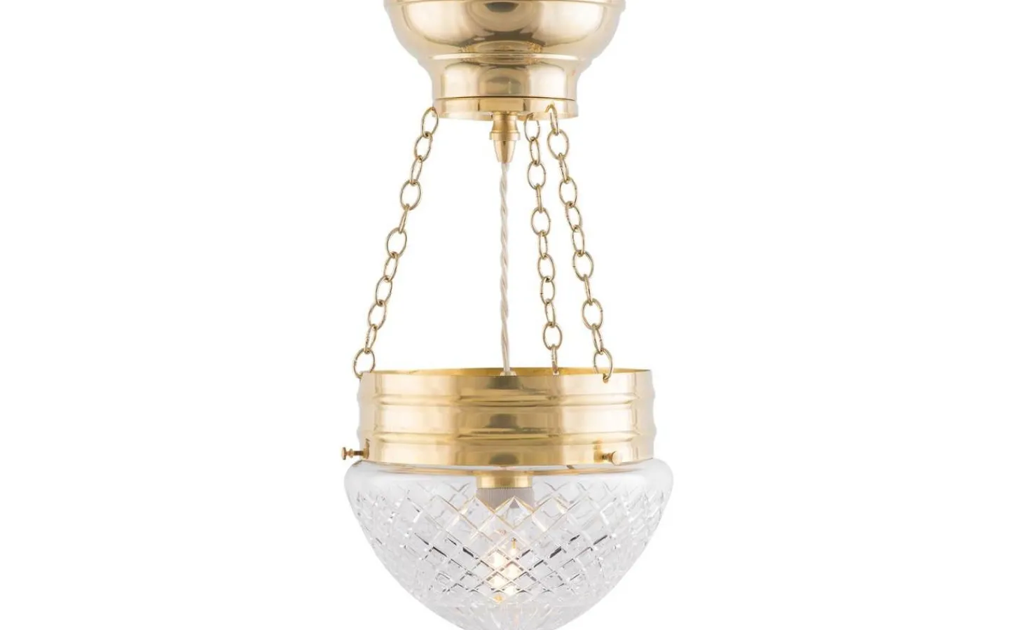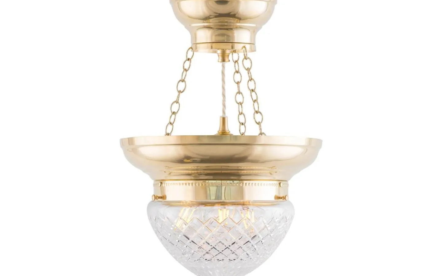 En klassisk kristallkupa i matterat klarglas med en slipad stjärna i toppen som ger ett mycket elegant och behagligt sken tillsammans med en ljuskälla av koltrådstyp. Detta droppformade glas förekom i vårt sortiment redan på 1890-talet.