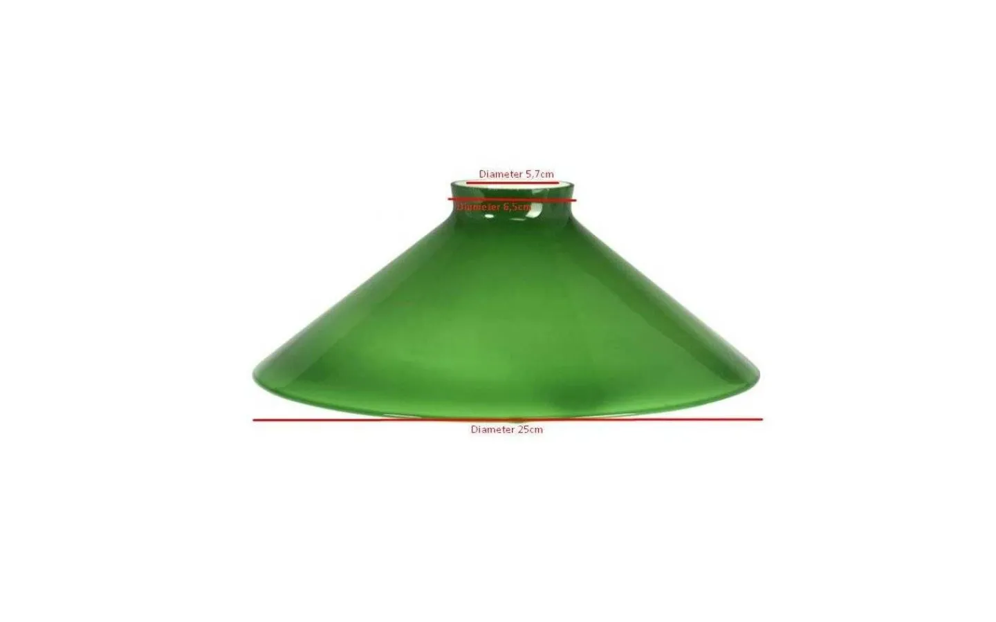 Skärm i grönt glas till klassisk skomakarlampa, från PR Home. Glasets diameter är 25 cm på bredaste stället. Diameter på hålet på ovansida skärm är innermått 5,7 cm och yttermått 6,5 cm.