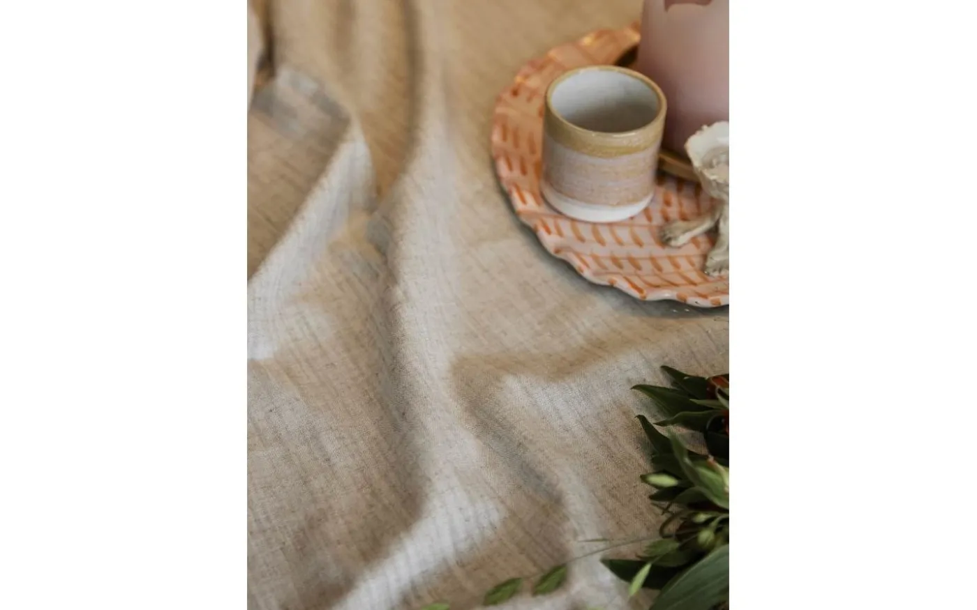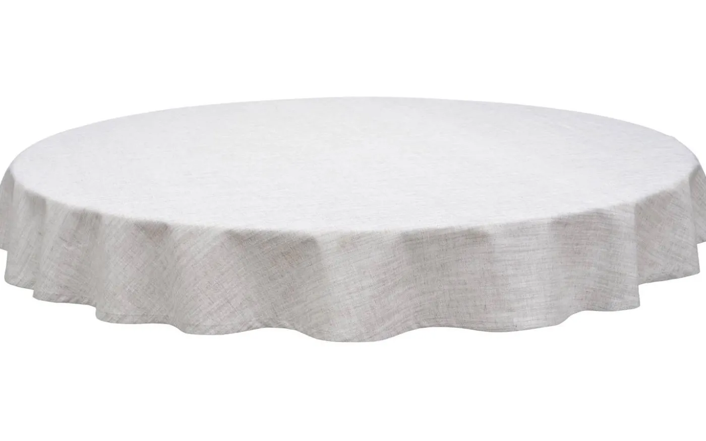 Sabina bordsduk från Svanefors är en rund duk av 90% bomull och 10% linne. Tyget är vävt med en chambrey som ger det ett linneliknande utseende. Duken är 200cm i diameter och passar för det stora runda bordet.