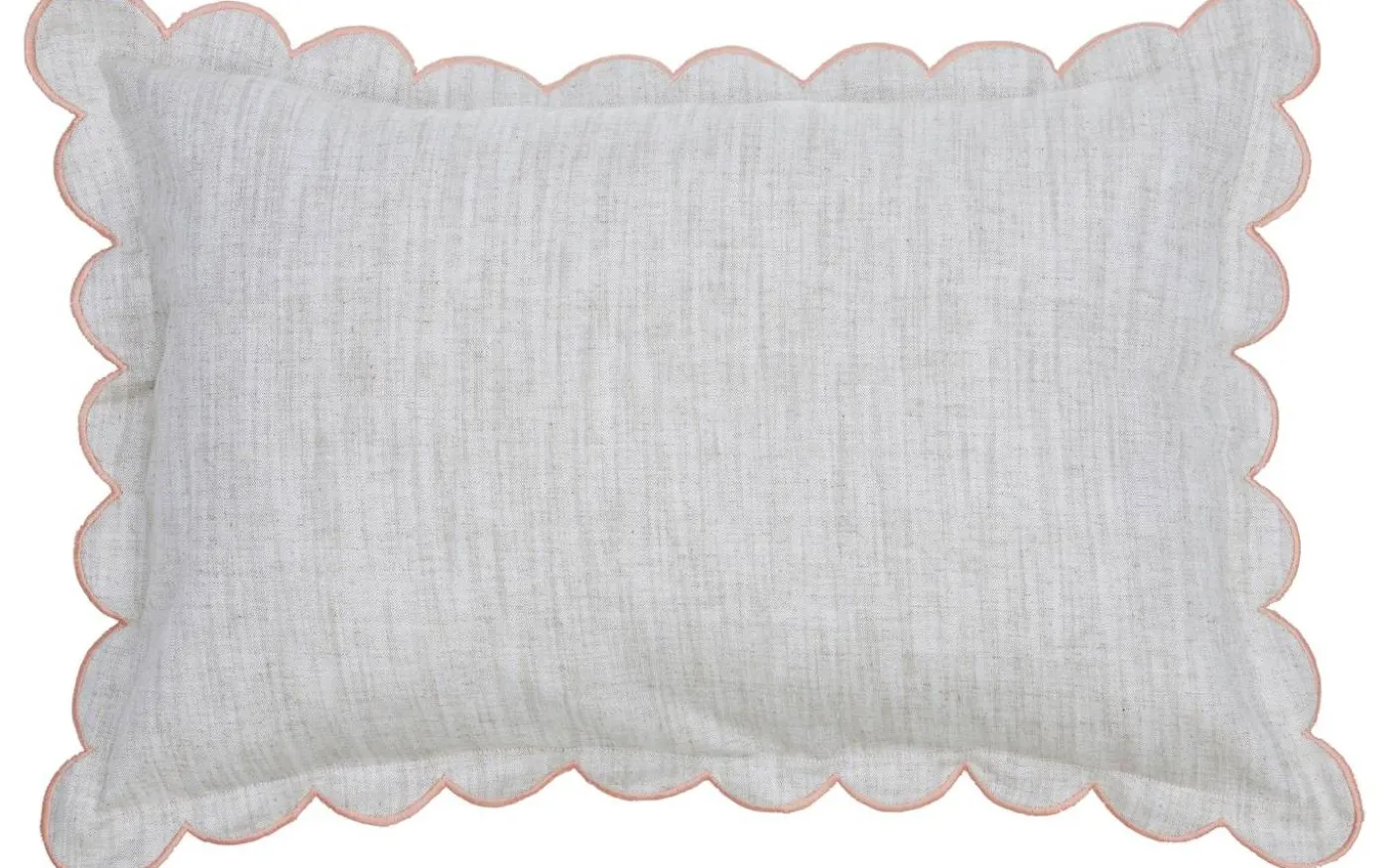 Kuddfodral i bomull/linneblandning med snäckskalformade kanter som är kantade med en korallfärgad tråd, tyget är chambreyvävt vilket ger det en linneliknande känsla. Kuddfodralet har en dold dragkedja på baksidan. Mått 40x60cm. Innerkudde köpes separat, för ett fylligt utseende så rekommenderar vi en innerkudde som är 50x75cm.