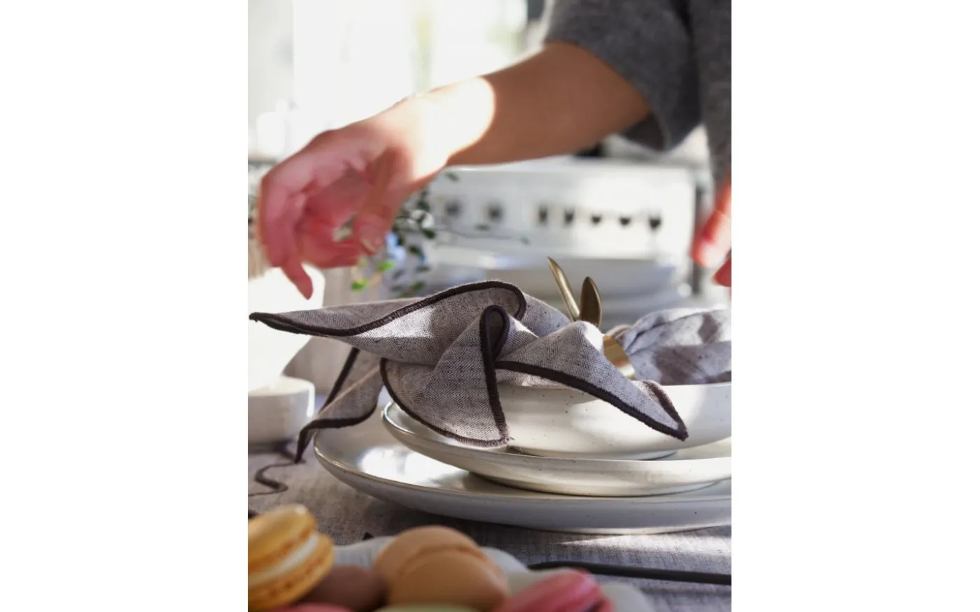 Servett med grå färgade overlockade kanter. Tyget ä rchambrayvävt vilket ger det en linneliknande känsla. Storlek 45x45cm. Produkten är certifierad enligt STANDARD 100 by OEKO-TEX®. Certifieringen garanterar att produkten är testad och fri från ämnen som kan vara skadliga för hälsan och miljön. 30 grader skontvätt Klorblekmedel får ej användas Får ej torktumlas Tål strykning med hög temperatur Kemtvätt (Perkloretylen)