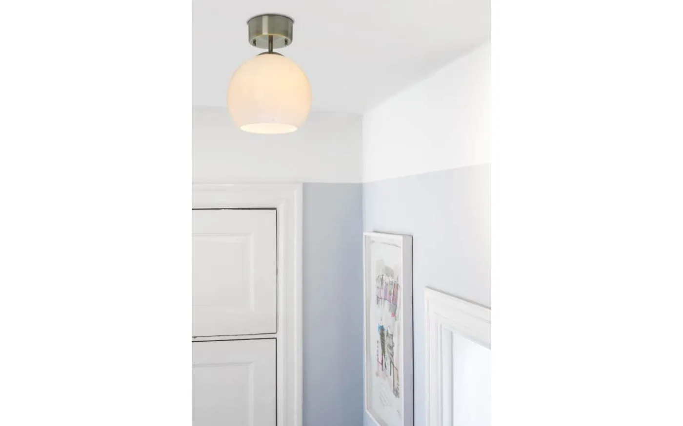 Salle är en stilren plafond, från Cottex, med stomme i mässingsfärgad metall med en antik finish och kupa i blankt, opalvitt glas. En fin och enkel plafond som passar lika bra i hallen som i köket.