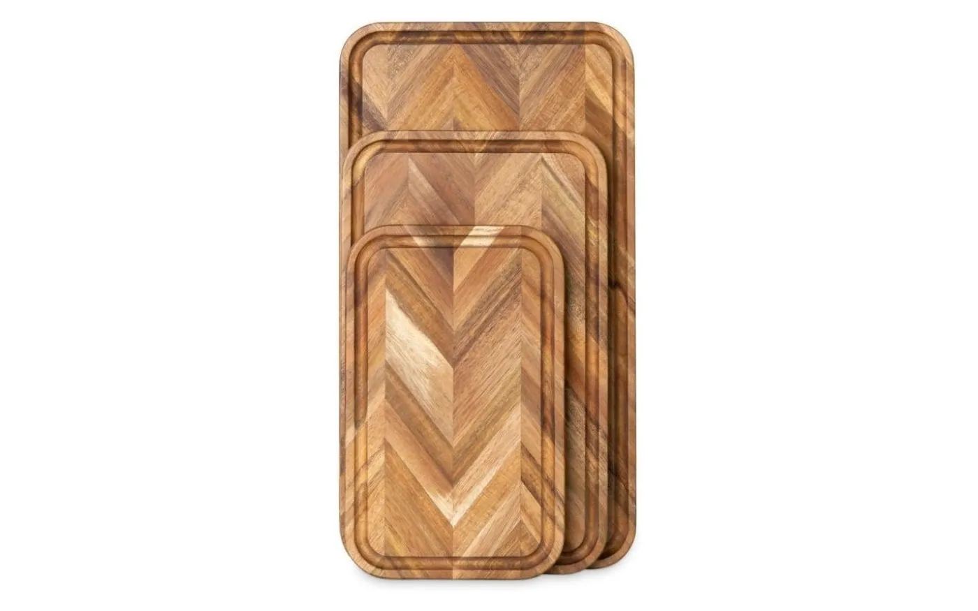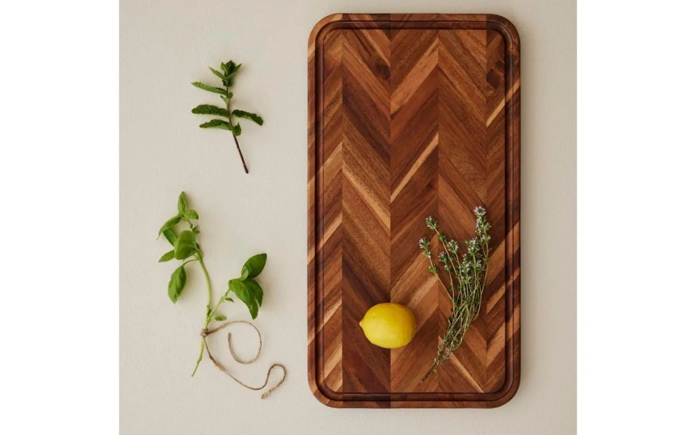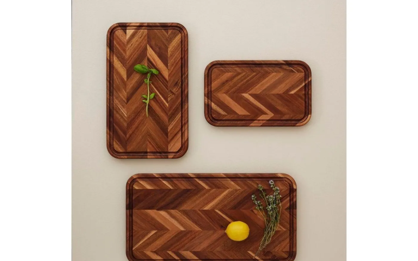 Skärbräda Large. Färg: Natur. Mått: 27×50 cm. Material: Fsc Akacia. Spring Board – en rustik och tidlös skärbräda tillverkad av vackert akaciaträ. Med sitt eleganta fiskbensmönster, förföriskt material och enkel design blir Spring Board inte bara ett praktiskt köksredskap, utan också en dekorativ detalj i sig själv.Denna skärbräda har utformats med omsorg och har en djup ränna som effektivt förhindrar köttsafter från att rinna ut över kanten. Den står stadigt på bordet och är lika lämplig för att skära bröd och kött som för att presentera utsökta ostar och tapasrätter. Spring Board finns i små, medelstora och stora storlekar för att passa olika behov.Observera att trä är ett organiskt material och kan med tiden deformeras. Genom att hantera din skärbräda på rätt sätt kan du dock minimera risken för detta. Vi rekommenderar att du alltid handtvättar skärbrädan och undviker att använda diskmaskinen. Se till att tvätta alla sidor noggrant, torka av den från överflödigt vatten och låt den sedan lufttorka.För att bevara träets skönhet och kvalitet rekommenderar vi att du regelbundet smörjer in skärbrädan med matolja. Torka sedan bort eventuell överflödig olja. Det är viktigt att du behandlar alla sidor av skärbrädan för att undvika ojämnheter i träet.Njut av användningen av Spring Board och låt den vara en pålitlig och elegant följeslagare i ditt kök. Med rätt skötsel kommer den att fortsätta vara en praktisk och estetiskt tilltalande skärbräda under lång tid framöver.Mått: 27×50 cmMaterial: FSC Akacia
