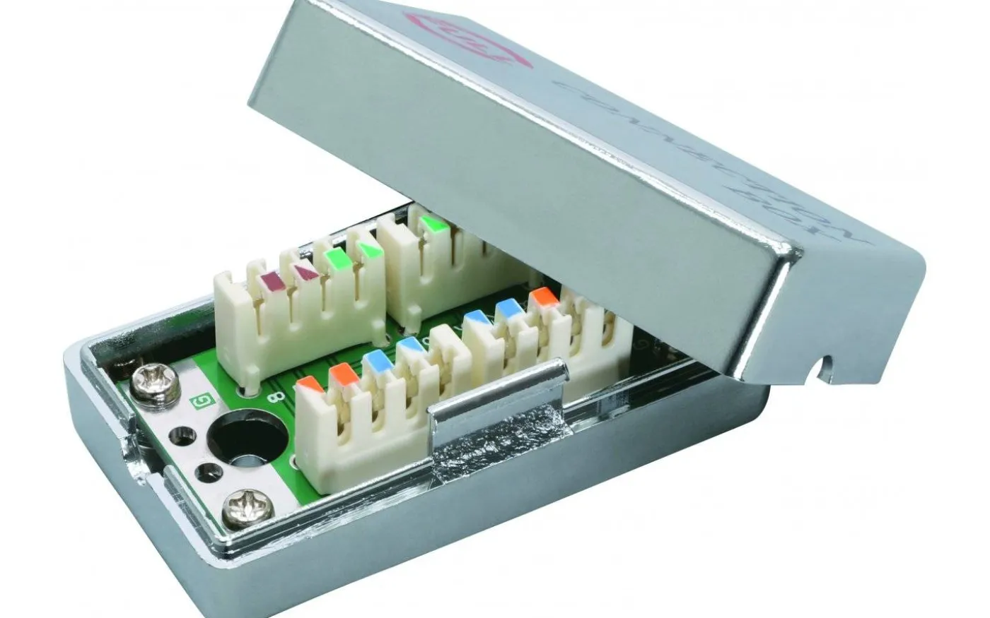 Skarvar ihop två Cat.5E kablar. Slitskontaktering med block av dualblockstyp.