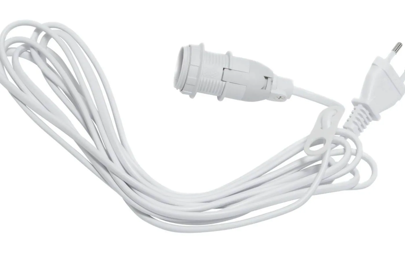 Vitt sladdställ med E14-sockel och stickkontakt för vägguttag. Perfekt sladd till julstjärnor!