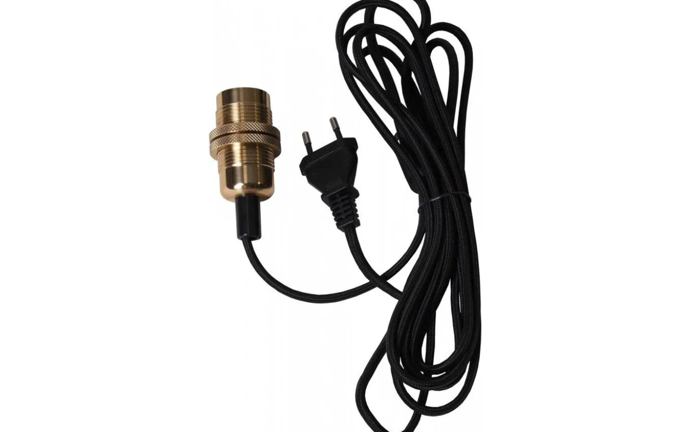 Sladdställ i metall med textilkabel på 3,5 meter med stickkontakt för vägguttag och E14 sockel.
