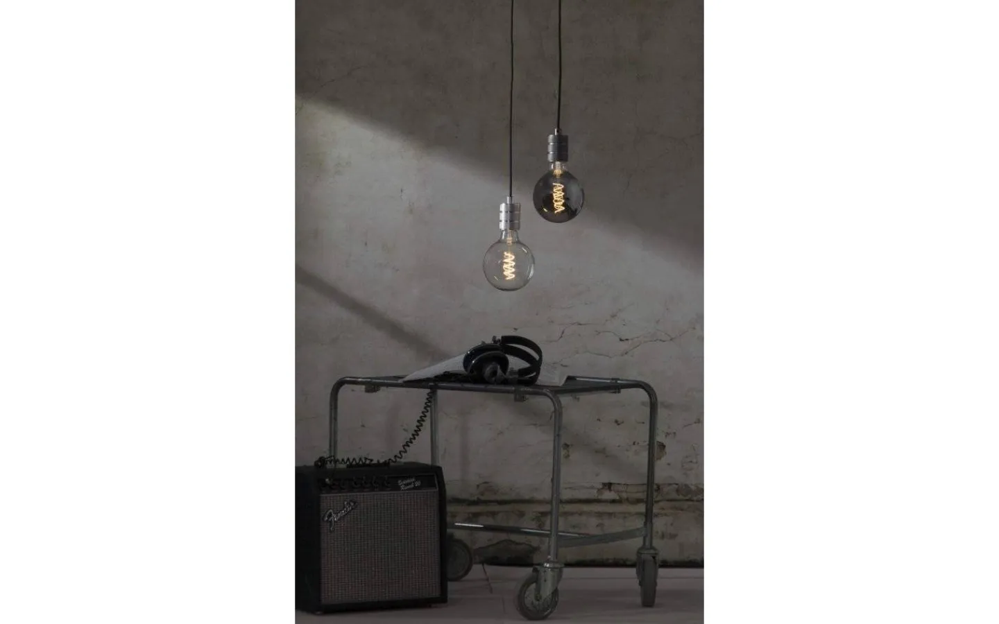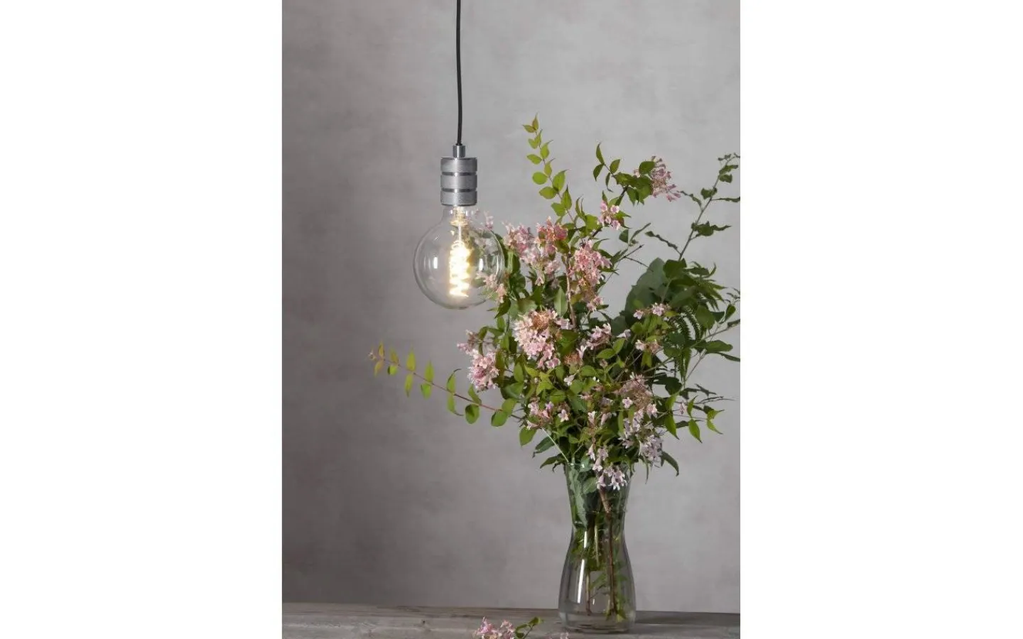 Sladdställ i metall med textilkabel på 3,5 meter med stickkontakt för vägguttag och E27 sockel.