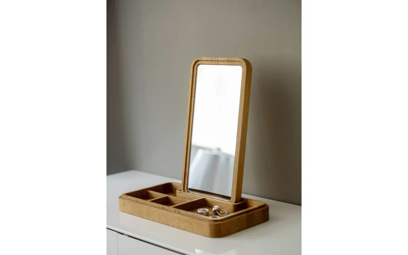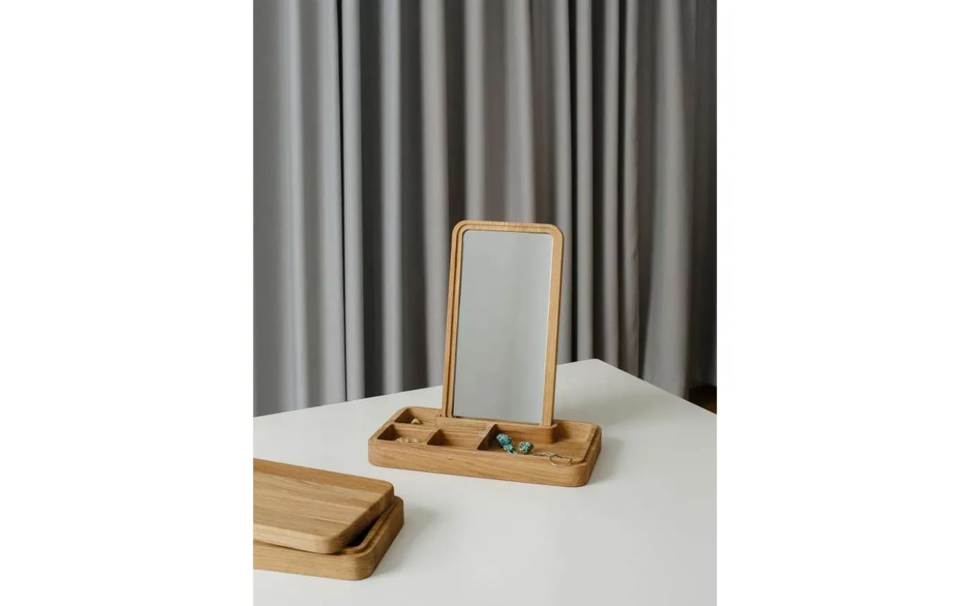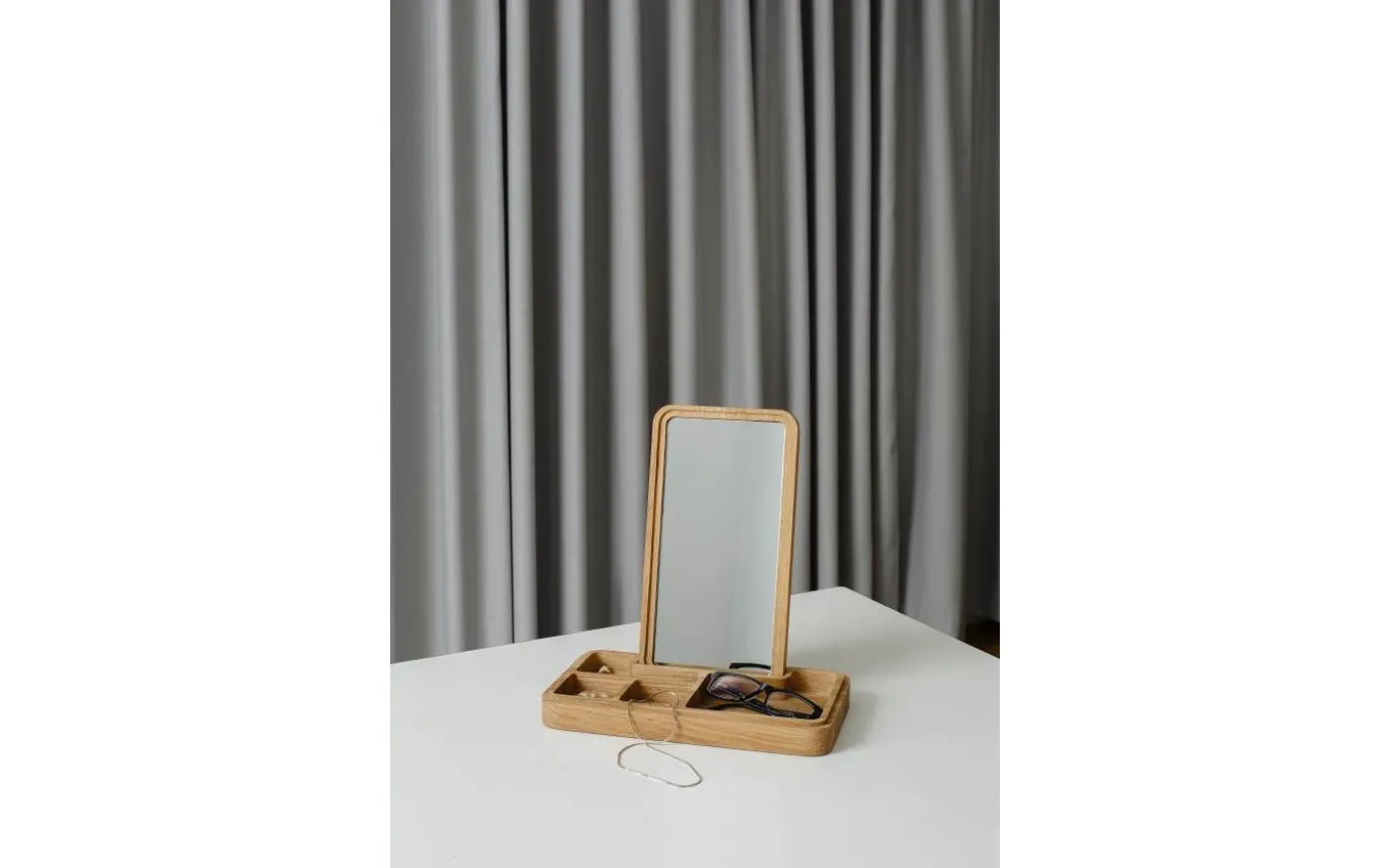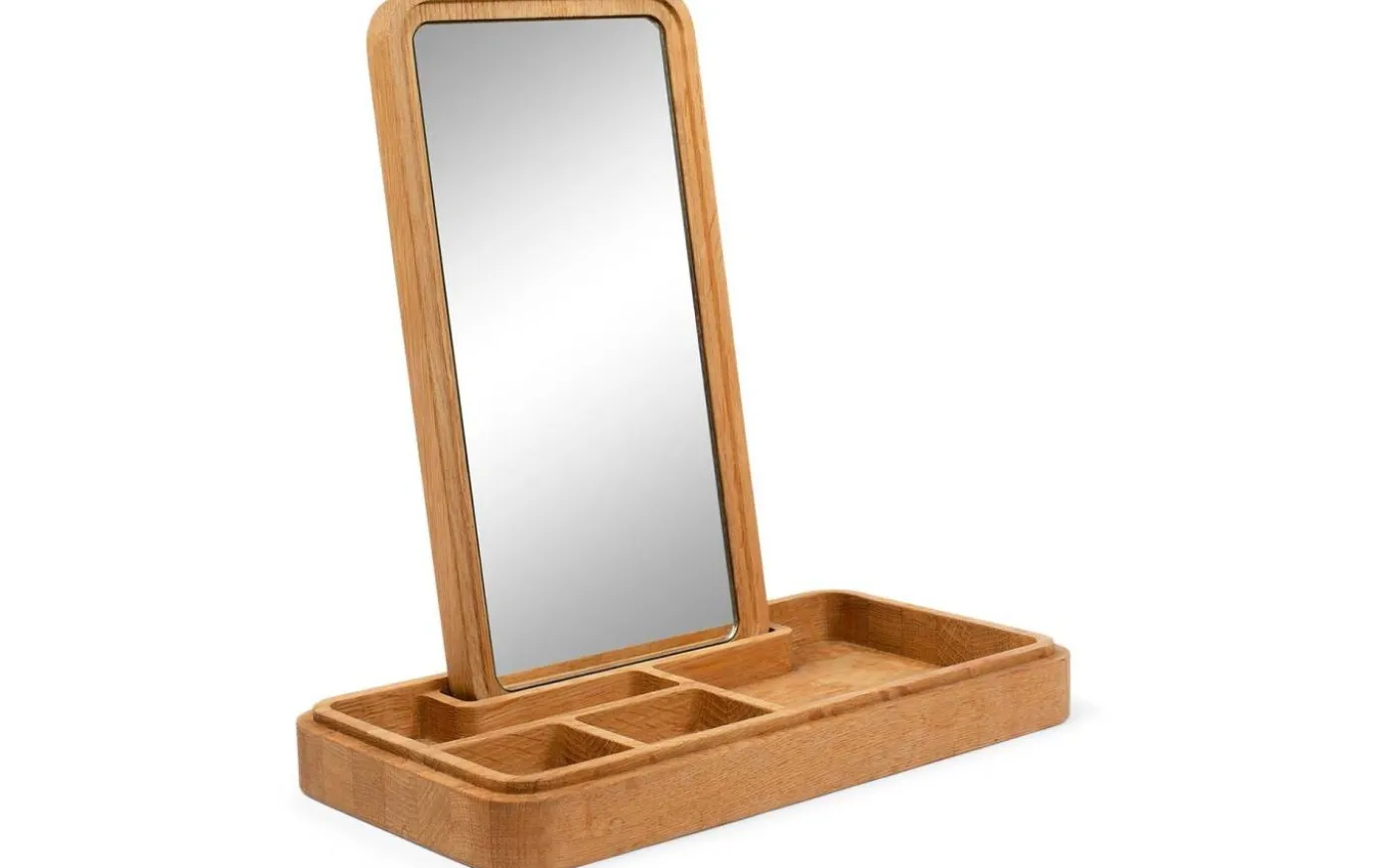 Design av Grounded Craftwork. Material: FSC-märkt ek Mått: 5,2x17x32 cm. Vikt: 1,435 kg. Handgjord. Rengöres med fuktad trasa. Underhåll ibland genom att smörja med bivax. Förvaringsskrin med spegel i locket. FSC-märkt ek. Mått: 5,2x17x32 cm. Vikt: 1,435 kg.