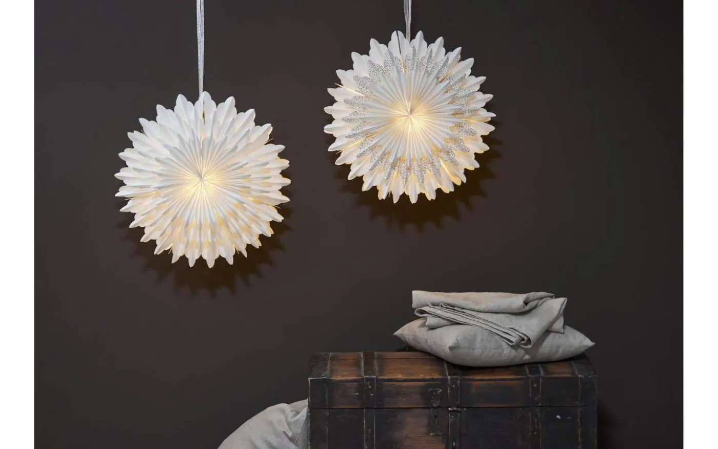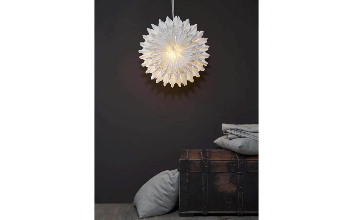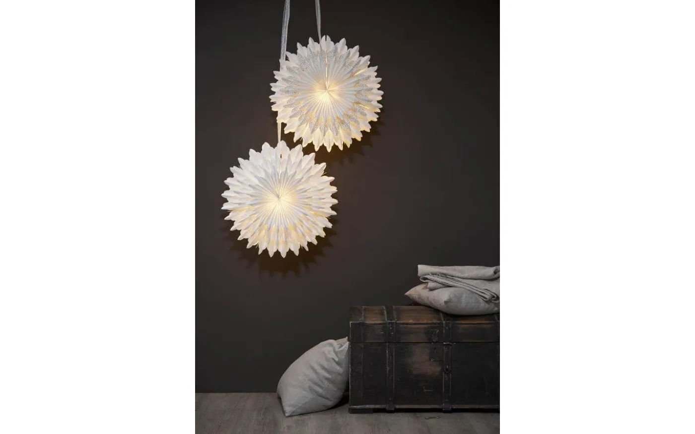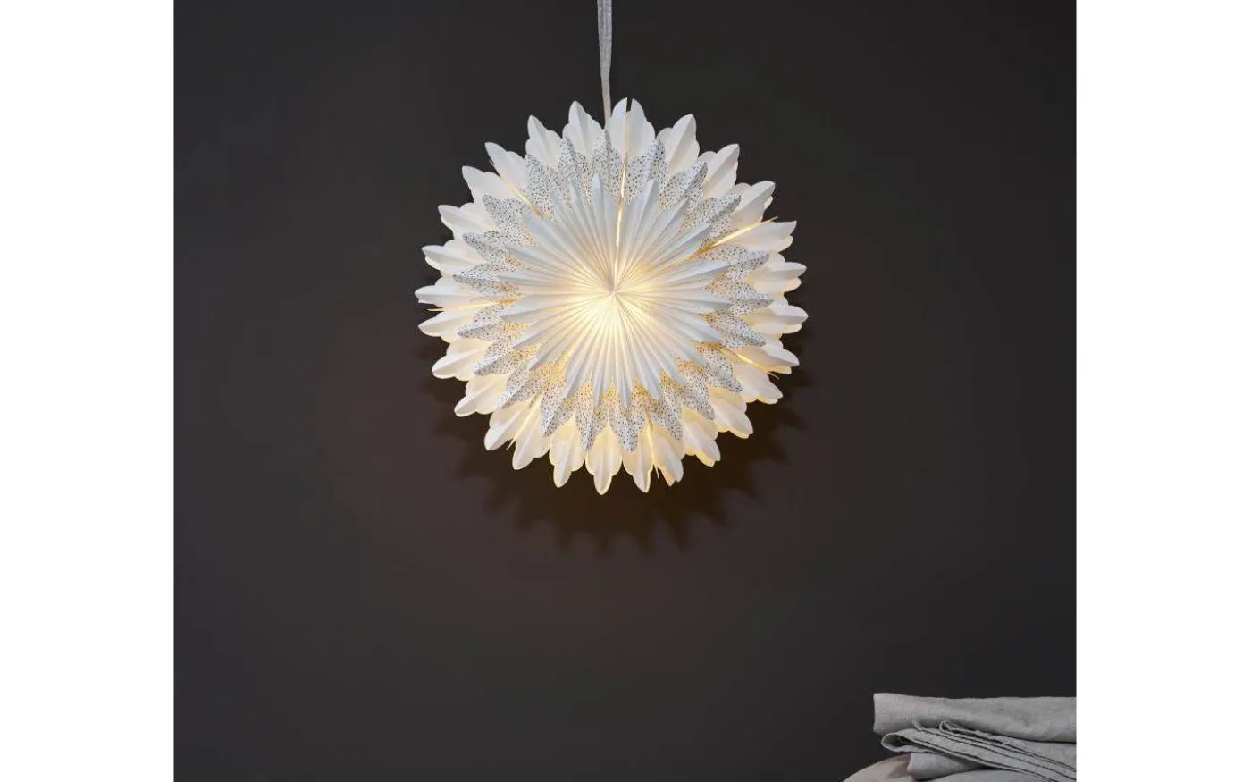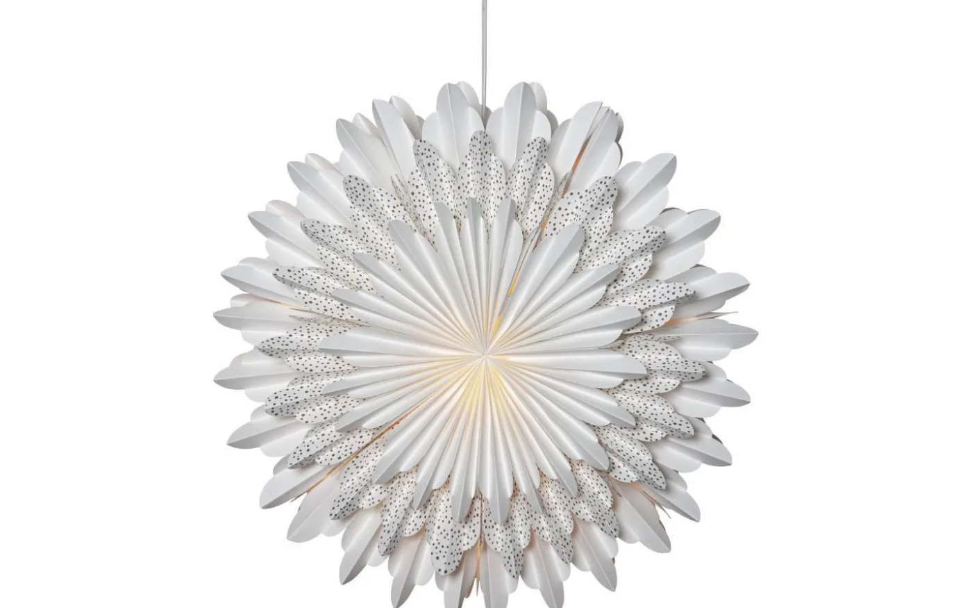 Snow julstjärna från Star Trading äre en vacker vit pappersstjärna med guld prickar på mellan lagret. Stjärnan har tre lager veckat papper. Ett elegant band ingår för att lättare kunna hänga upp stjärnan. Snow julstjärna sprider härlig stämning och ger hemmet den där speciella julkänslan.
