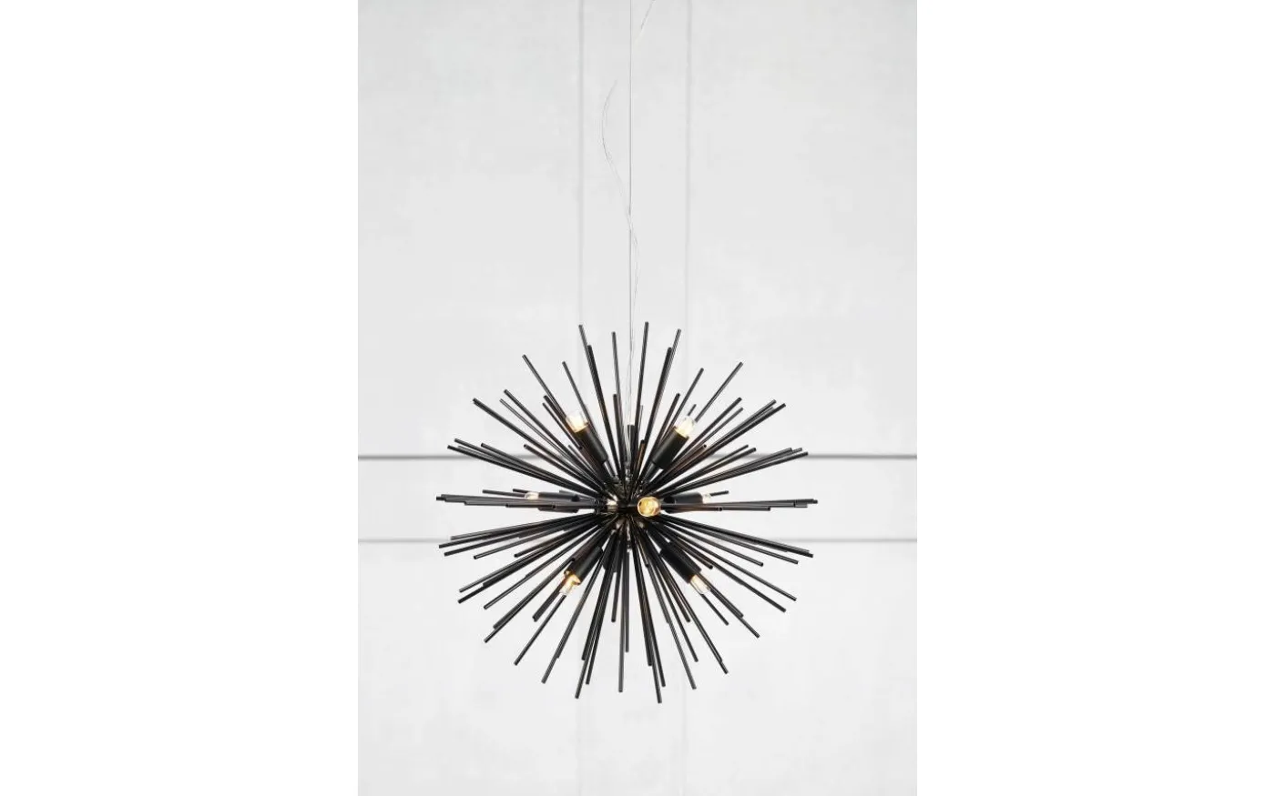 Soleil är gjord av metall och massor av smala, svartlackerade rör som tillsammans bildar denna praktfulla taklampa. Du hänger lampan enkelt direkt på takkrok och den 1,5 meter långa kabel justeras efter eget önskemål.