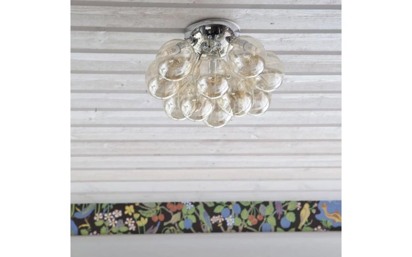 Gross från välkända By Rydéns är en snygg plafond som passar i de flesta utrymmen. Plafondens upphäng i blank krom kombinerat med 12st munblåsta, amberfärgade glaskulor ger lampan ett exklusivt och trendigt intryck. De skira glaskulorna släpper genom ett fantastiskt ljusflöde och lampans storlek gör den lättplacerad. Till plafonden behöver du 3st G9 ljuskällor, dessa säljes separat – se passande förslag under tillbehör.