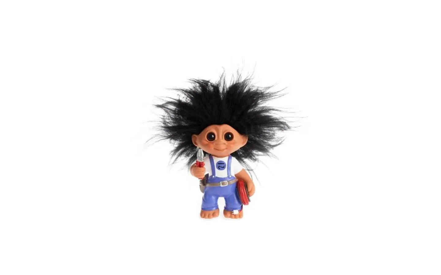 Lyckotroll Elektriker. Vardagstroll. Höjd: 9 cm. Material: Polyresin, fårskinn.