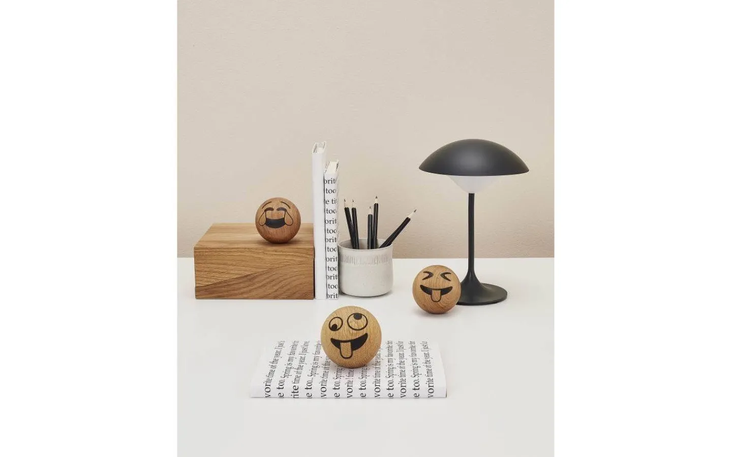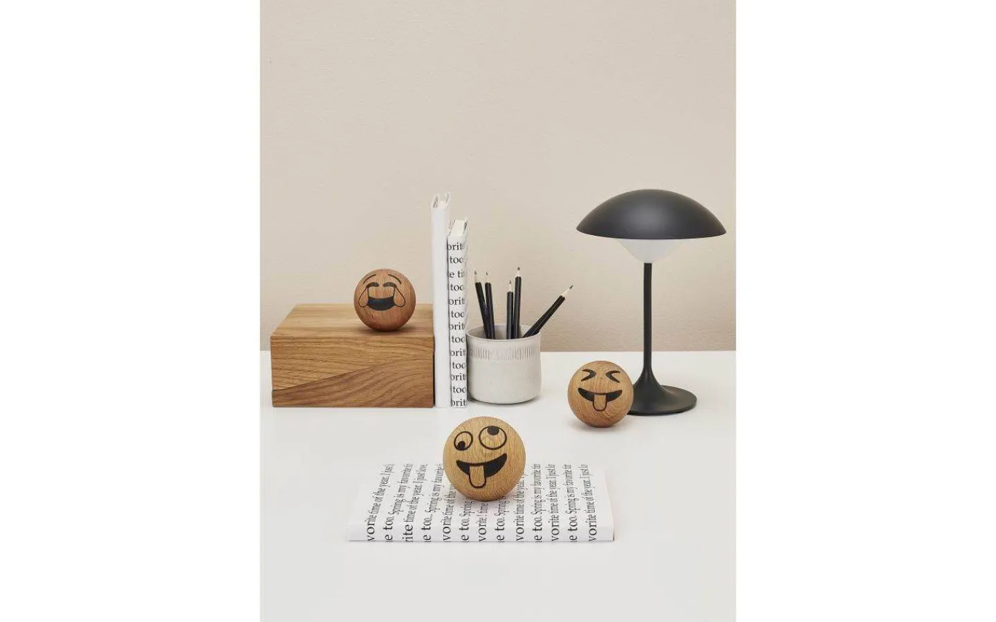 Emojibollen Silly är fylld med energi och bra vibrationer. Bollen är tillverkad i ek och designen står mencke&vagnby för.
