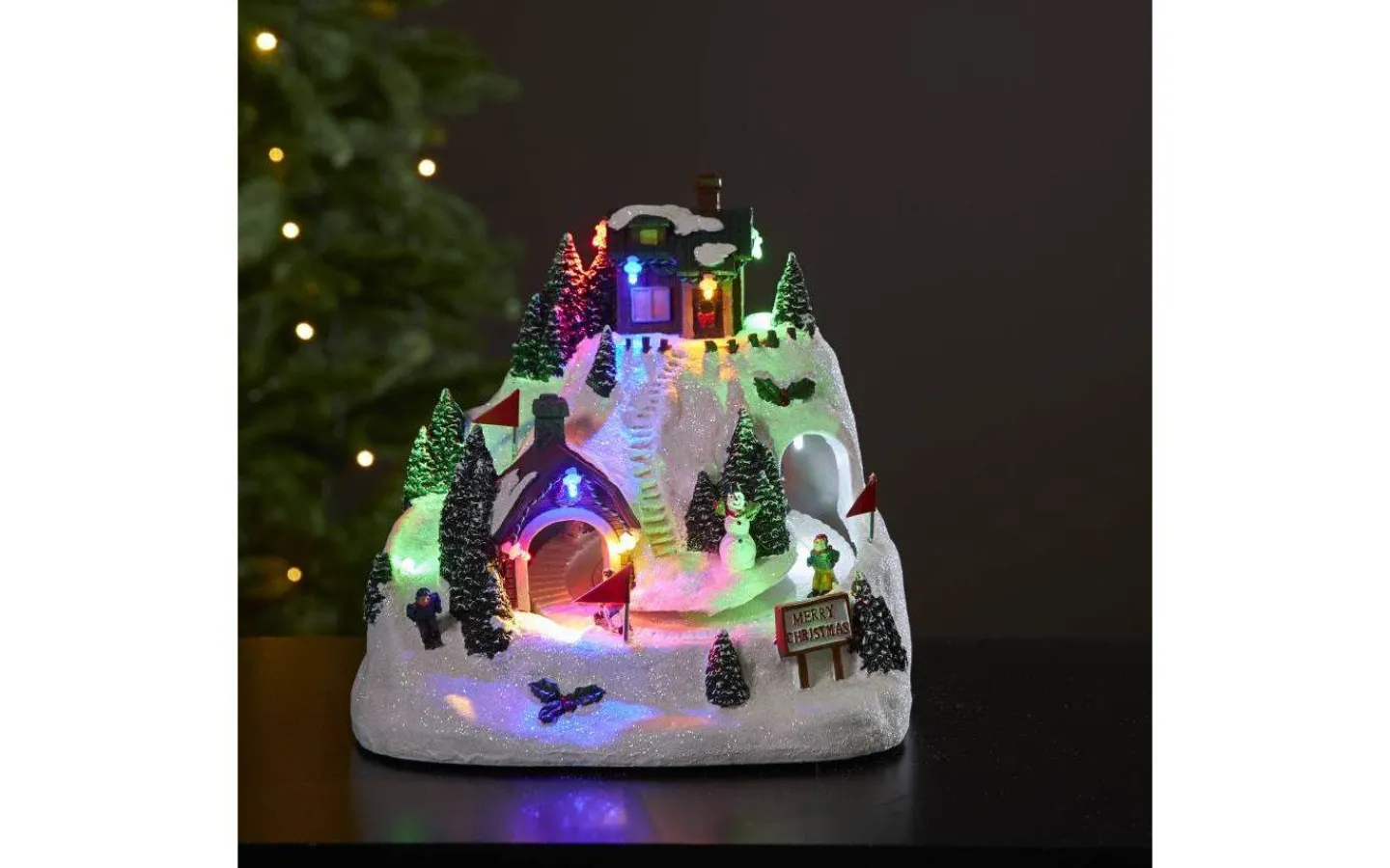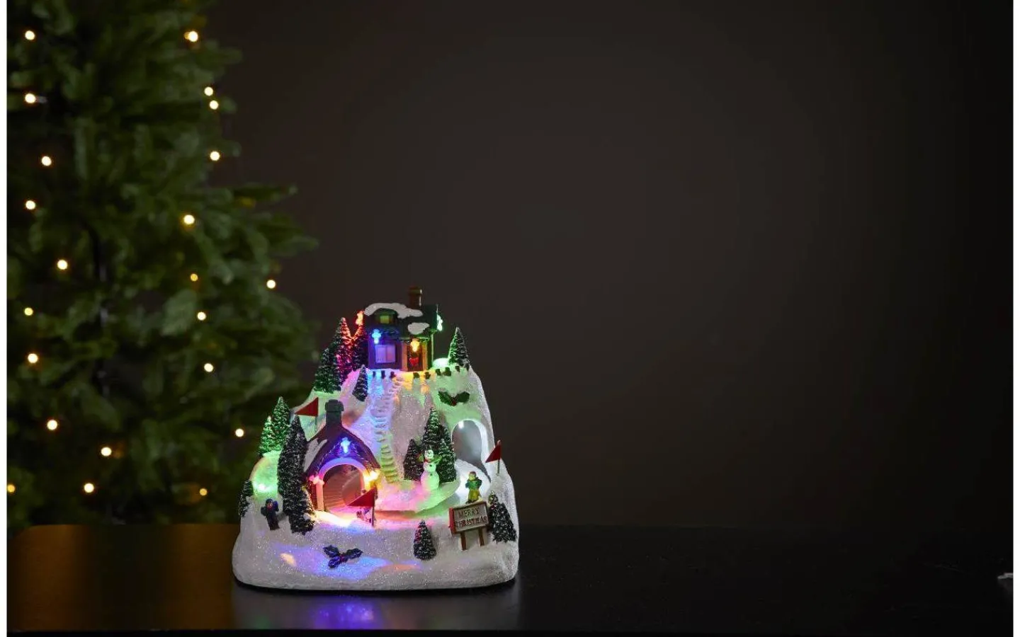 En härlig juldekoraion, samling kring skridskobanan. Det lyser mysigt i partybelysningen. Alltihop ger en härlig julkänslan. Skridskobanan roter och om man vill spelar byn 8 julsånger. Dekorera till advent och jul, passar både barnrummet och på en skänk.