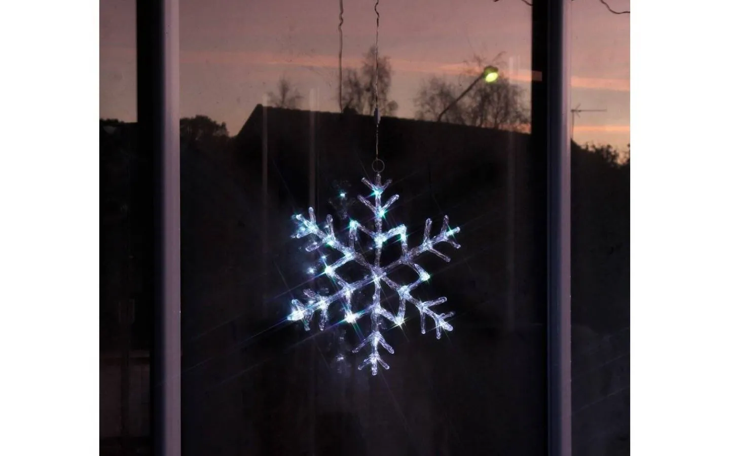 Vacker snöflinga att pryda fönstret utomhus eller inomhus. En 24V AC transformator medföljer.