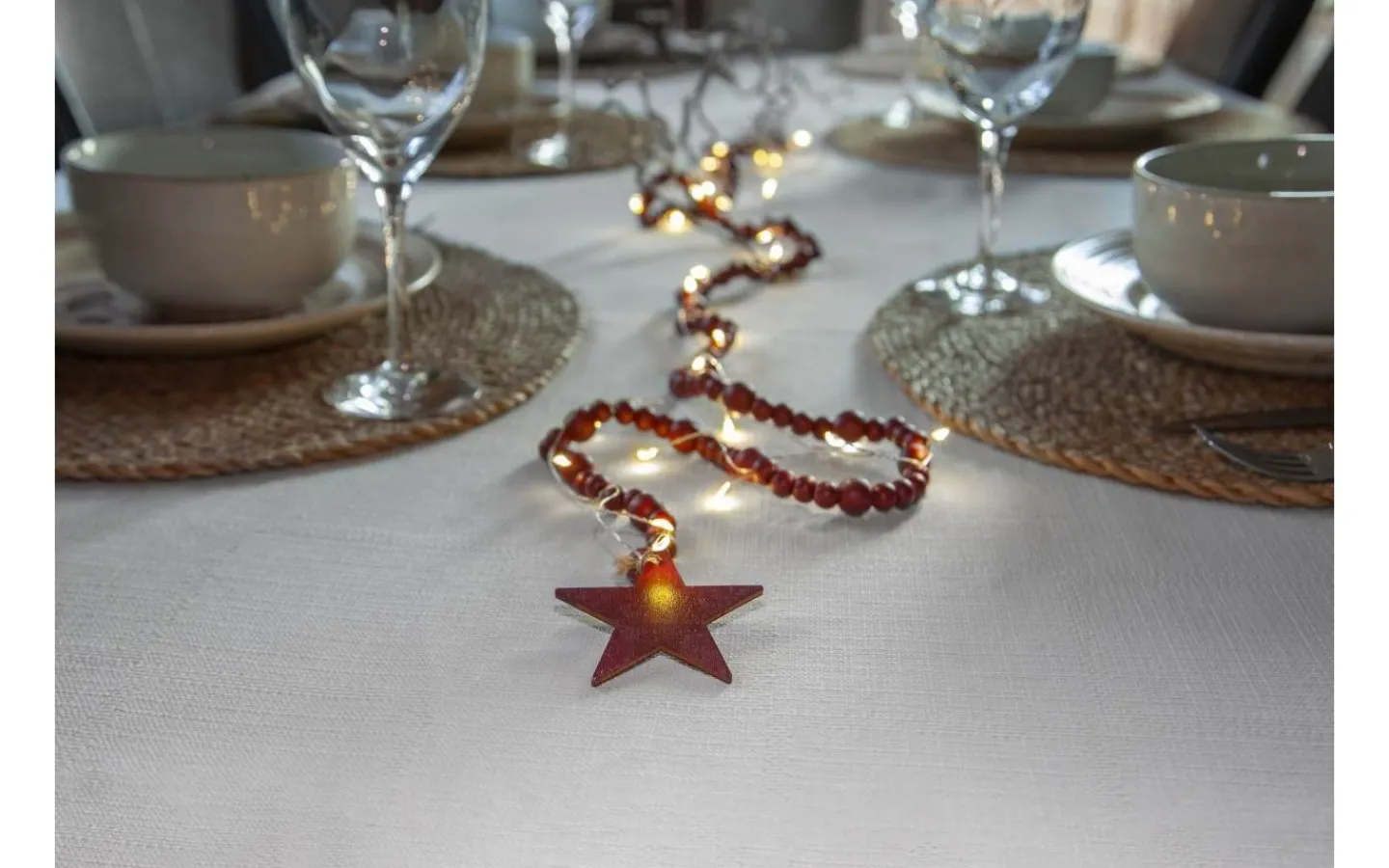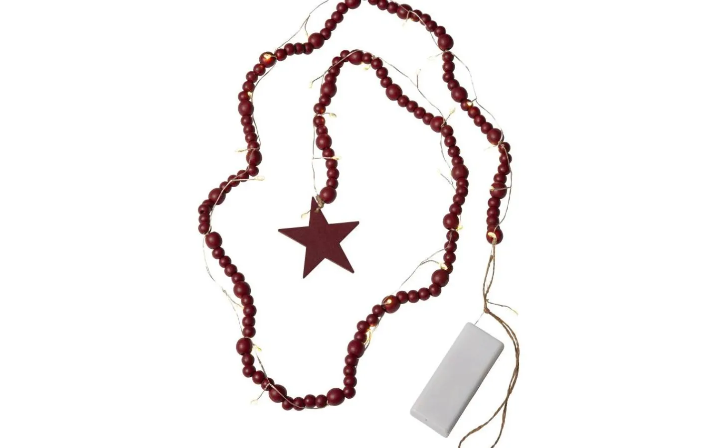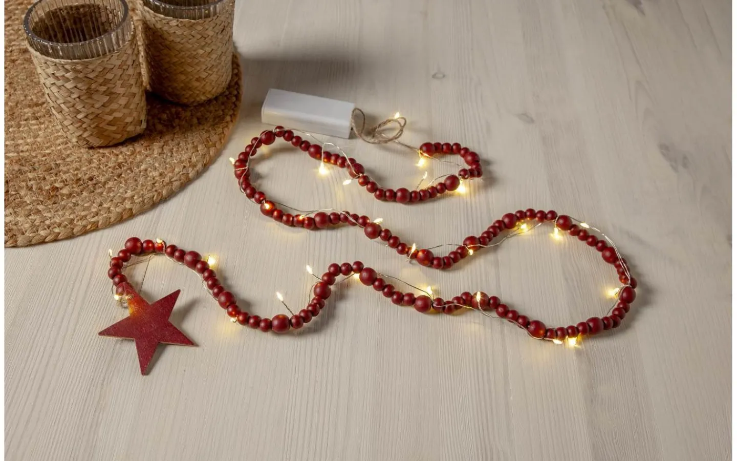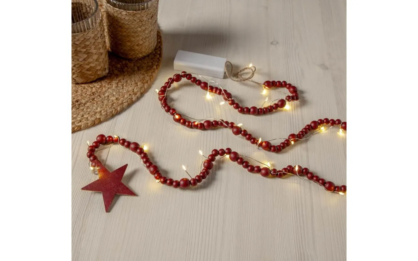 Exklusiv ljusslinga för inomhusbruk med träpärlor. Röd färg som matchar våra ljusstakar. Tunn metallslinga med 30 varmvita LED virad runt pärlorna ger ett vackert sken, passar till bordsdekoration och julgransdekoration. Batteribox med timerfunktion. 2 batterier AA ingår ej. Batteritid ca. 80h.