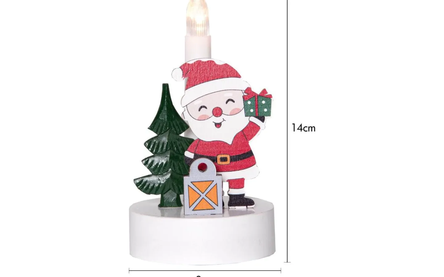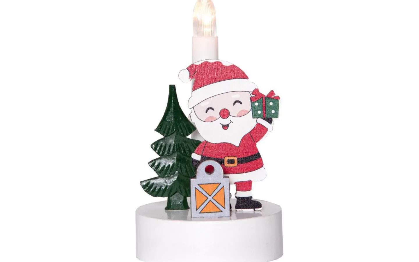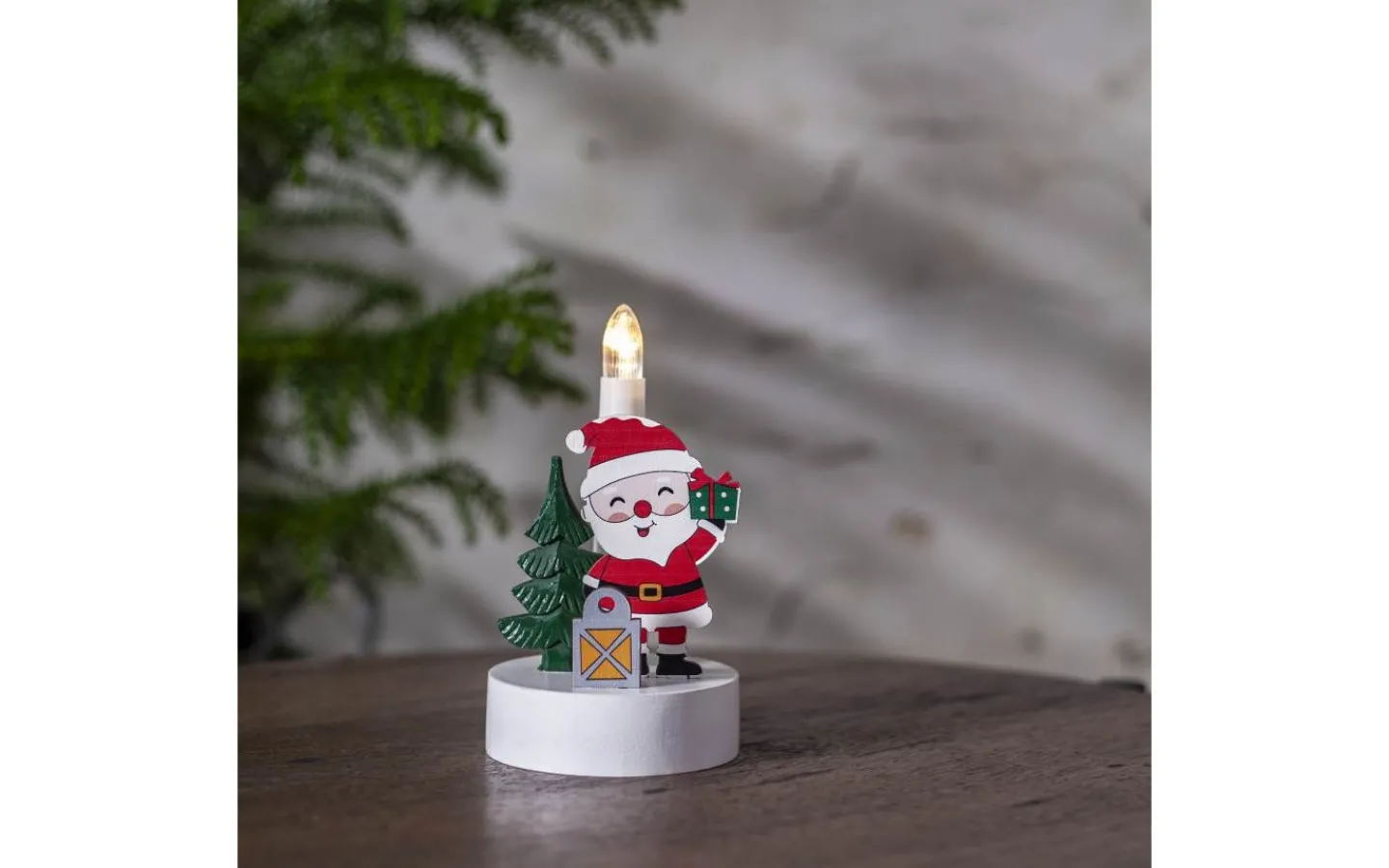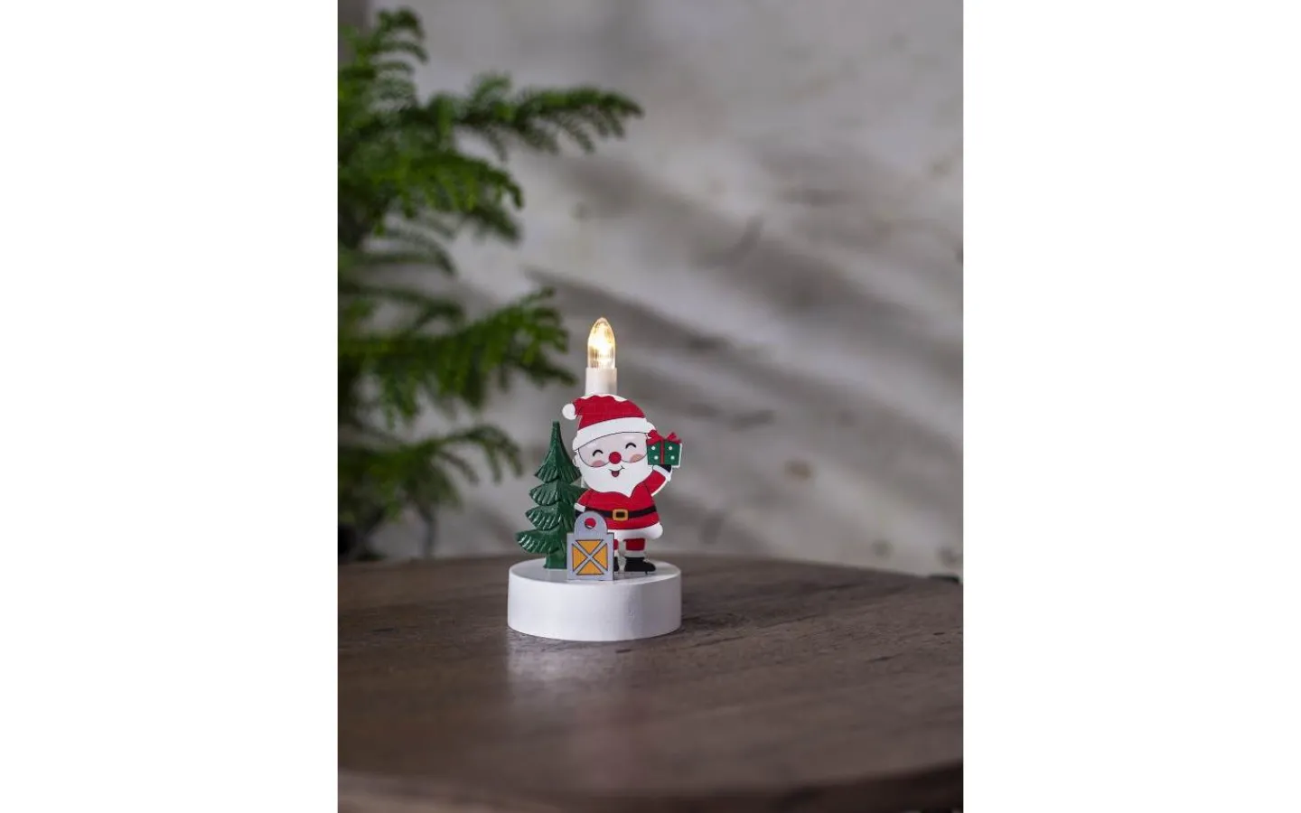 Juldekoration med utskuret motiv i trä. Liten, lättplacerad ljusstake som drivs av batteri. Lyser med fint varmvitt sken och skapar julstämning med sitt söta julmotiv. Dekorationen har timer. 2 batterier AAA ingår ej.