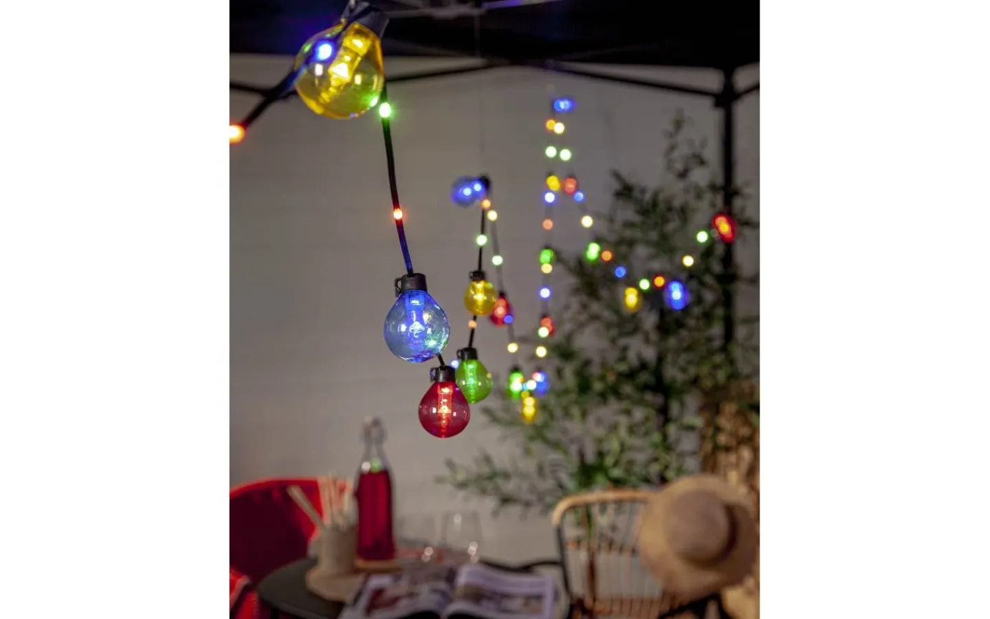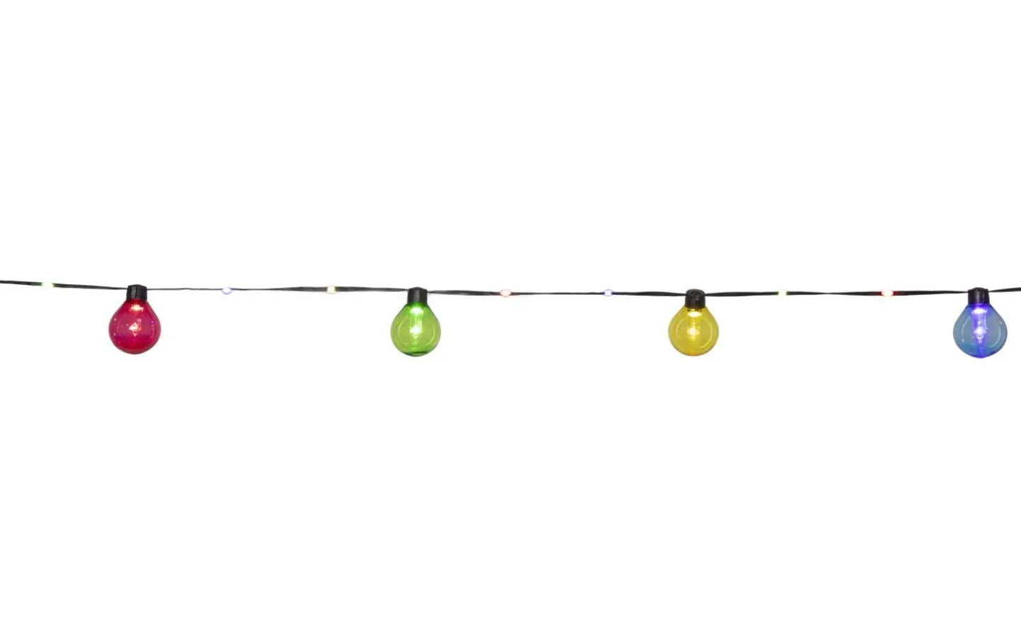 Ljusslinga för utomhusbruk med 20 st färgade glober som är 4 cm i diameter, mellan varje glob finns ytterligare 2 ljuspunkter på kabeln, samtliga ljuspunkter har multifärgat sken. Passar både till vardags och festliga tillfällen.