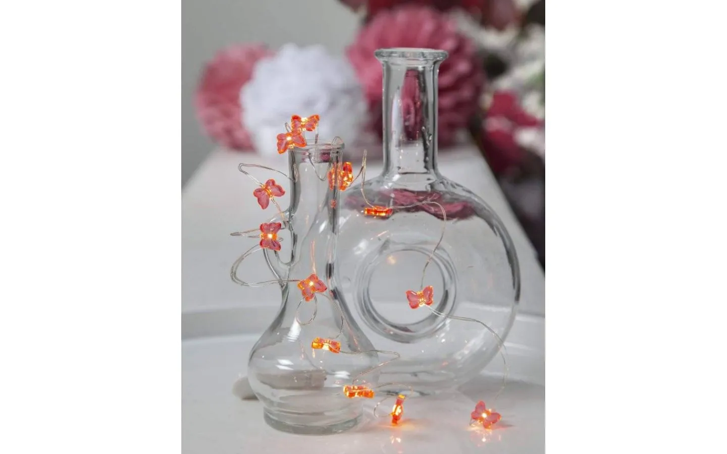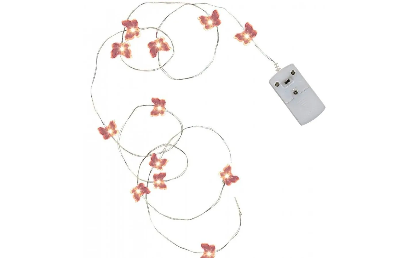 Butterfly Dew Drop är en söt ljusslinga i silverfärgad metall med små, rosa fjärilar i plast. I varje fjäril finns en liten LED-lampa som avger ett dekorativt ljussken. Eftersom ljusslingan är i metall är den enkel att forma och blir en fin dekoration att lägga i en glascylinder, i en blomma eller som en mysbelysning i en bokhylla.