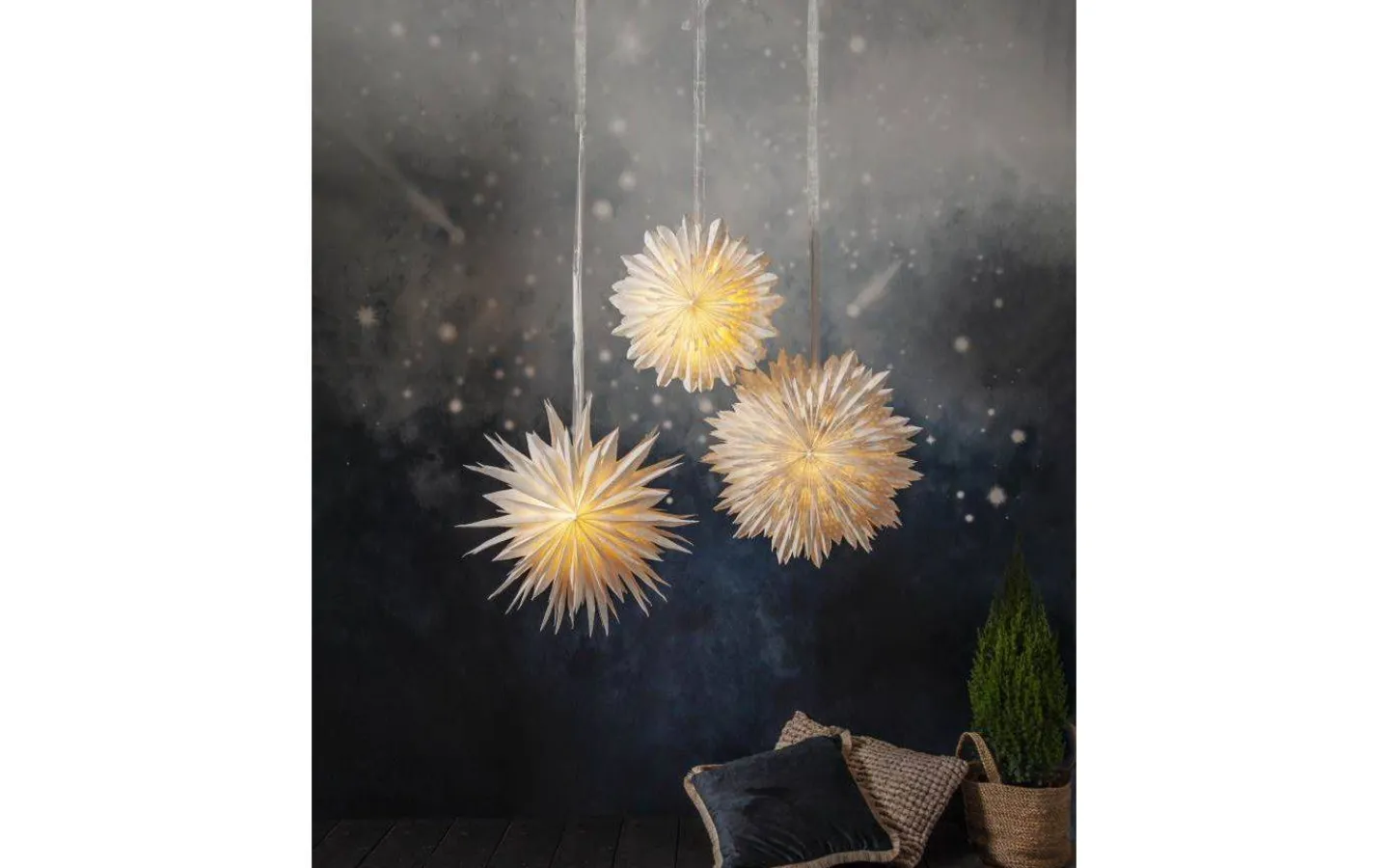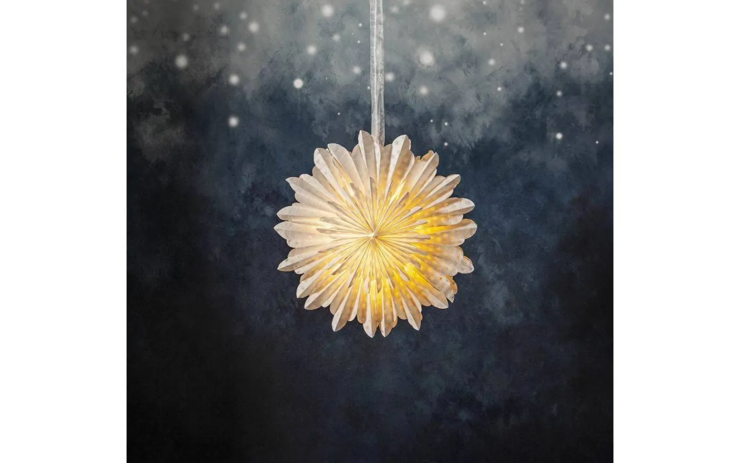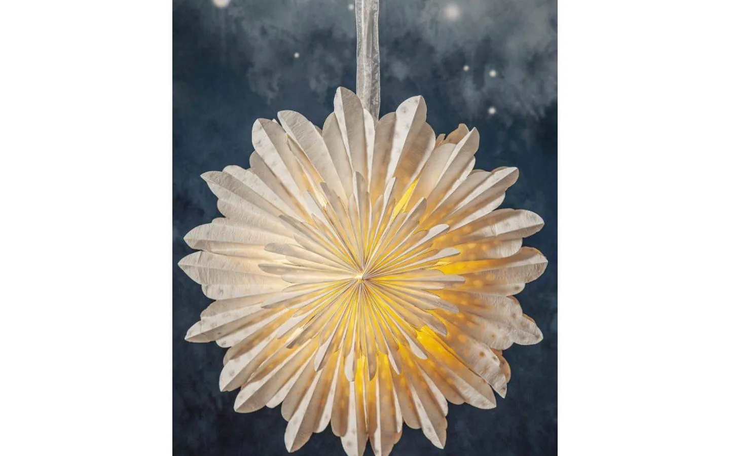 Cloud julstjärna från Star Trading är en magisk pappersstjärna med två lager veckat papper som är tillverkat av återvunnen bomullsspill från t-shirt tillverkning. Strukturen i pappret är mjukt och i själva pappret ser man vattenstämplade prickar. Konturen har mjuka rundade flikar. Ett elegant band medföljer för att lättare kunna hänga upp stjärnan.