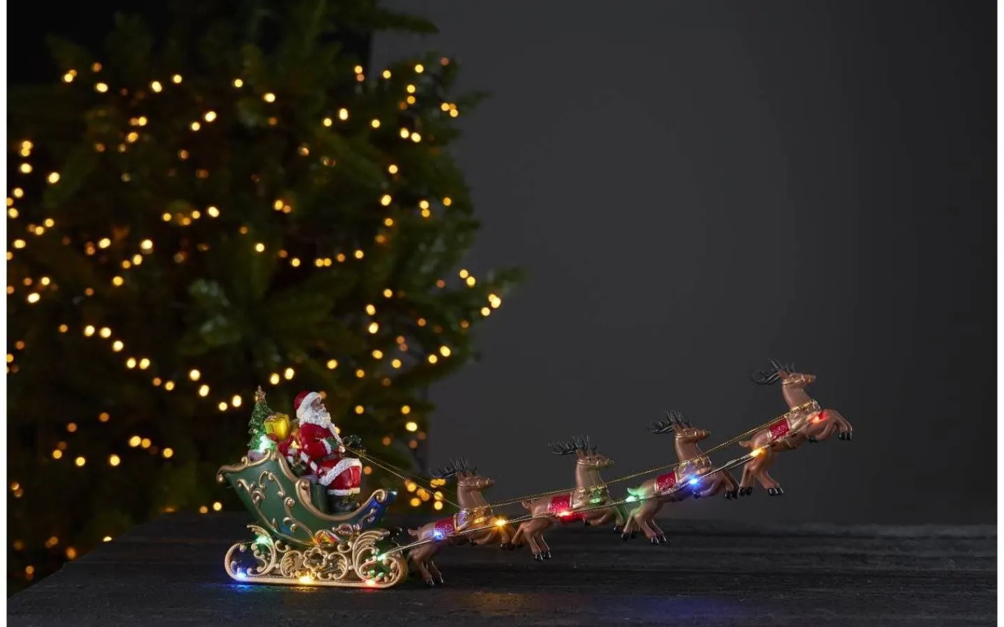Deerville Panorma, från Star Trading, är en söt dekorativ juldekoration i formen av jultomten på sin släde och fyra renar som bär av upp i luften. Denna lekfulla dekoration lyser i rött, grönt och blått och har sammanlagt 15 stycken ljuspunkter. Med alla fina detaljer kommer Deerville definitivt vara en mysig detalj bland julpyntet.
